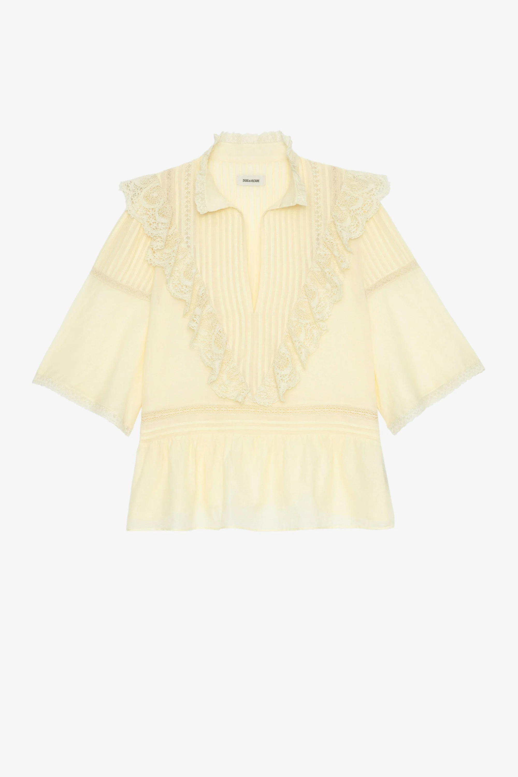 Women’s yellow guipure ruffled top Description & details This light, romantic top features guipure ruffles and a basque. - Zadig&Voltaire women’s yellow top - High neck - Wide three-quarter-length sleeves - Ruffles - Small basque Model is 180 cm/5'9" and is wearing a size S Composition 73% Cotton 27% Viscose Product code: WWTO00020_BUTTER