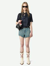 Satin top with short sleeves and button fastening. Description & details - Top in Japanese satin - Round neckline with button fastening and ruching - Short sleeves This item fits true to size. Choose your usual size. Composition 57% Polyester** 43% Polyester Care - Hand-wash or machine-wash inside out in a mesh laundry bag on a 20°C delicate cycle with a maximum spin speed of 400 rpm - Air dry flat - Iron inside out at a maximum of 110°C Product code: WWTO01960_ENCRE