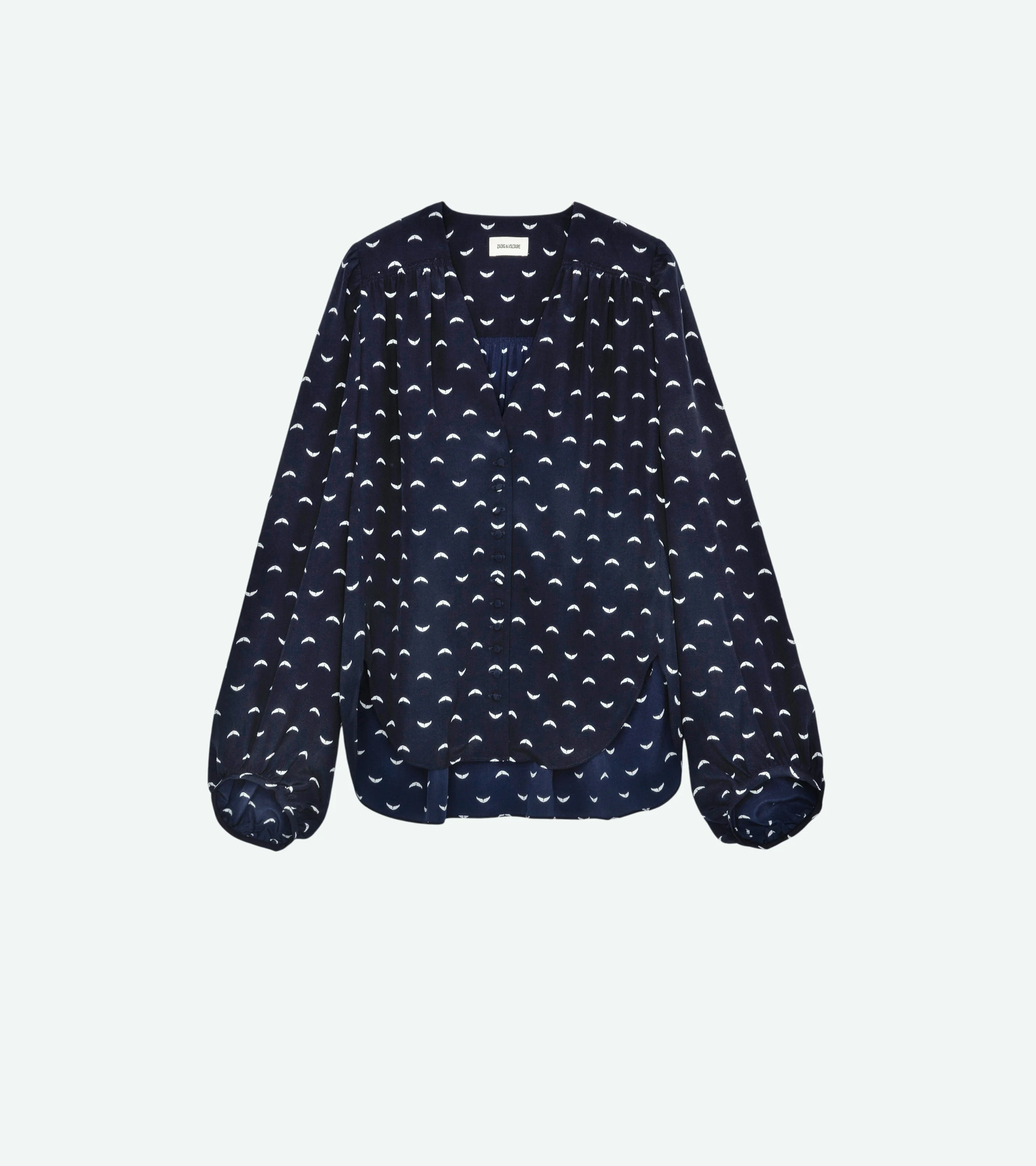 Women’s navy blue silk shirt with wings print. Description & details - Women’s flowing navy blue blouse - Silk with wings print - V neckline - Long asymmetric sleeves, mitred cuffs and button fastening - Gathered detail and pleats at the back Model is 175 cm / 5' 8" and is wearing a size S This item is true to size. We recommend buying your usual size. Composition 100% SILK Care Hand-wash or machine-wash your garment at a maximum of 68°F, in a mesh laundry bag and inside out, with a gentle spin cycle. Air-dry. Iron your garment on a low heat setting or steam from a distance of 8 in, being particularly careful with customized details. Product code: WWSH00521_MARINE