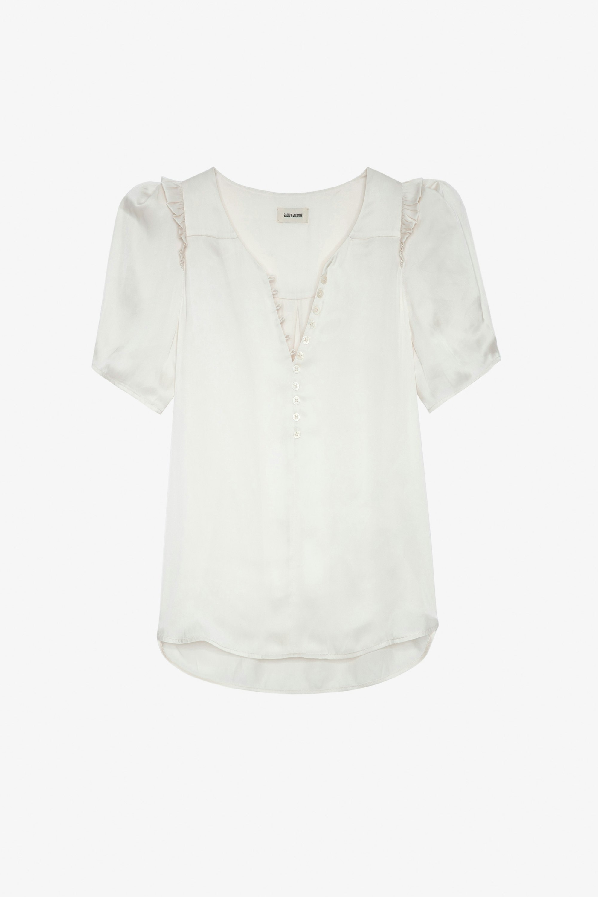 Women’s off-white satin ruffled blouse. Description & details - Women’s off-white linen satin flowing blouse - Round collar, V neckline and button placket - Ruffle details and pleats on the back - Short balloon sleeves Model is 180 cm / 5' 10" and is wearing a size S This item is true to size. We recommend buying your usual size. Composition 100% POLYESTER Care Hand-wash or machine-wash your garment at a maximum of 68°F, in a mesh laundry bag and inside out, with a gentle spin cycle. Air-dry. Iron your garment on a low heat setting or steam from a distance of 8", being particularly careful with customized details. Product code: WWTO00016_LIN