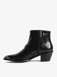 Ankle boots in python-effect leather adorned with signature buckles and metallic wing-shaped studs. Description & details - Low ankle boots in python-effect leather - Zip closure - Signature wing buckles - Pointed toe with signature metallic wings This item fits true to size. We recommend choosing your usual size. Composition 100% Calfskin Care - Protect your leather item from humidity and any source of heat (radiator, sun) - Avoid your item coming into contact with water - Regularly maintain the shine of your smooth or grained leather shoes with a leather polish Product code: SWCT02066_BLACK