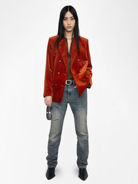 Structured straight blazer in velvet with double-breasted button closure. Description & details - Velvet blazer jacket - Double-breasted button closure - Classic collar - 2 side flap pockets and 1 piped pocket - Shoulder pads - Long sleeves - Regular fit Model is 178 cm / 5' 10" and is wearing a size 36 This item has a loose fit. For a more fitted look, choose one size down from your usual size. Composition 100% Cotton Care This garment should be dry-cleaned only. Product code: WWBL01943_BURN