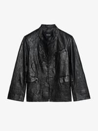 Fitted blazer without buttoning in crinkle leather. Description & details - Fitted blazer in crinkle leather - Piped pockets, flap pockets and welt pockets - 7/8 sleeves with shoulder pads - An emblematic material of Zadig&Voltaire, crinkle leather is achieved through a multi-step process imagined by the house, guaranteeing a unique product with exceptional craftsmanship. Model is 180 cm / 5' 10" and is wearing a size S This item has a fitted cut. If you are between sizes or prefer a looser fit, go for one size up. Composition 100% Lambskin Care This garment should be cared for by a leather professional. Product code: RWBL01084_BLACK