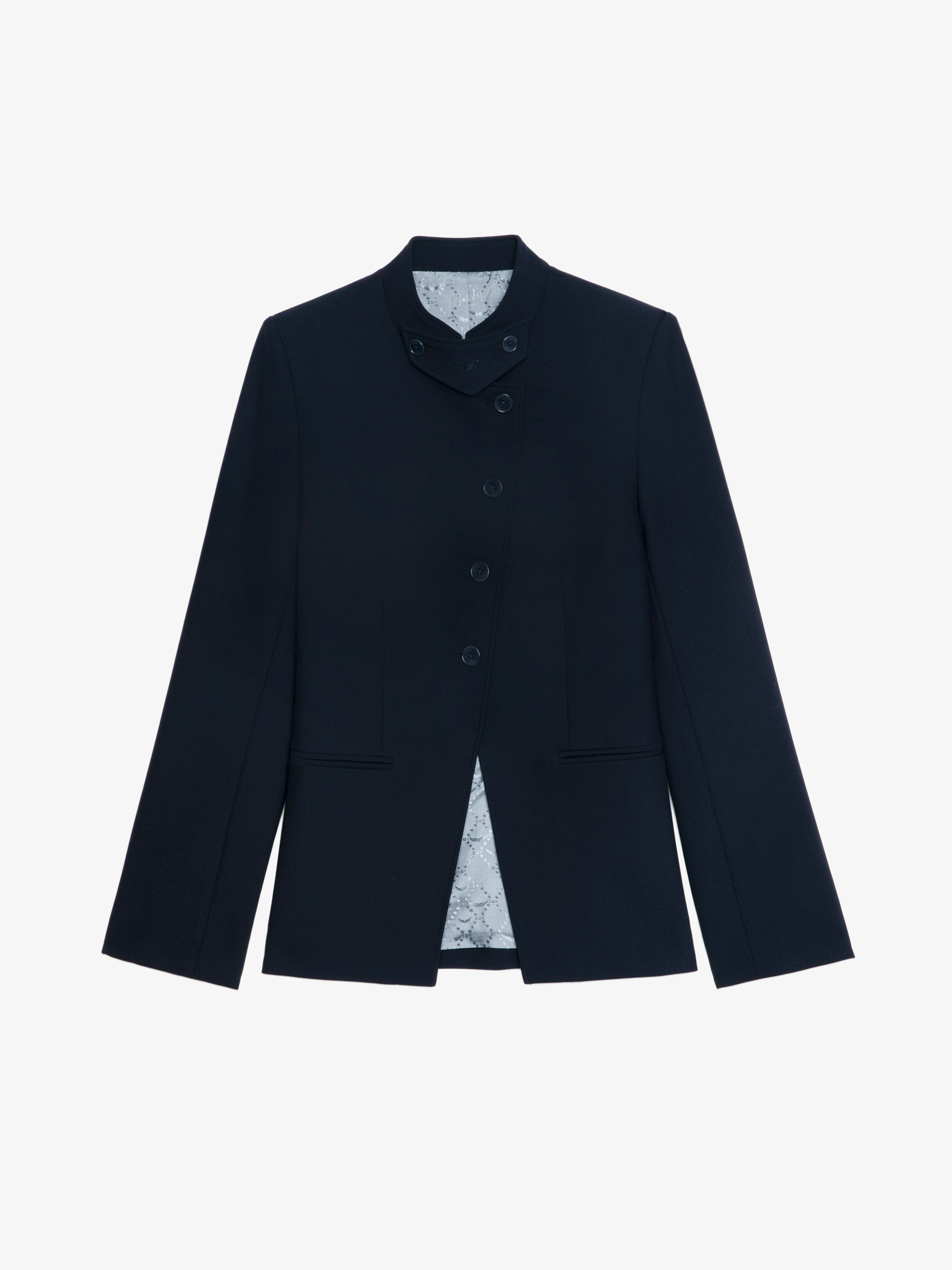 Structured regular fit blazer, high collar and rhinestone wing applique, button fastening. Description & details - Blazer - Stand-up collar with two decorative buttons - Asymmetric front button fastening - 2 welt pockets - Long sleeves with shoulder pads - Wing-shaped rhinestone detail on the collar Model is 180 cm / 5' 10" and is wearing a size 36 This item fits true to size. Choose your usual size. Composition 43% Polyester** 26% Polyester 23% Viscose 8% Elasthanne Care This garment should be dry-cleaned only. Product code: WWBL01944_ENCRE