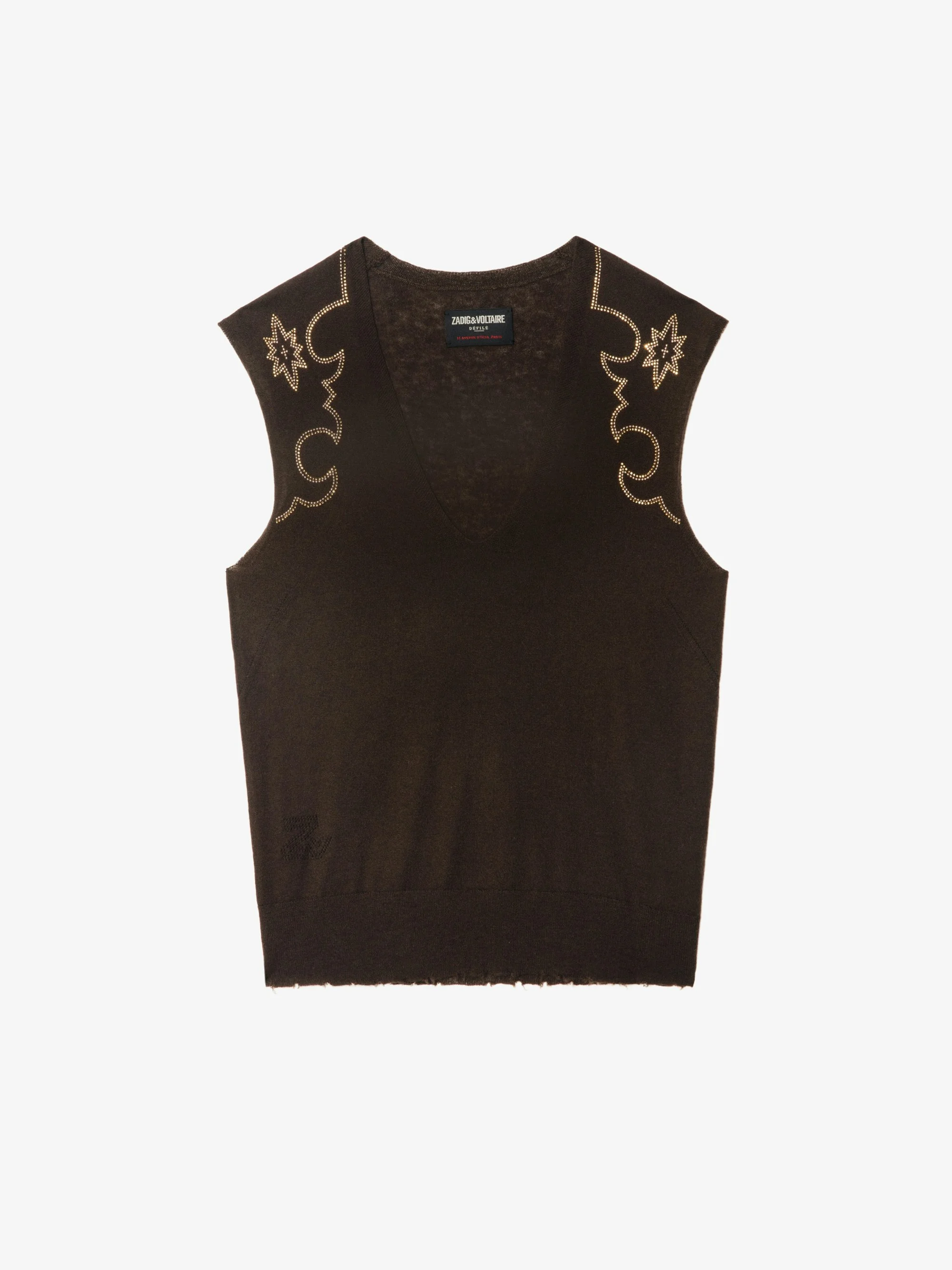 Sleeveless V-neck sweater with rhinestones. Description & details - Sleeveless sweater in 100% cashmere - Western-inspired rhinestone details on shoulders - V-neck - ZV logo Model is 180 cm / 5' 10" and is wearing a size S This item fits true to size. Choose your usual size. Composition 100% Cashmere Care - Hand-wash or machine-wash on a 20°C wool cycle with a maximum spin speed of 400 rpm - Do not wring - Air dry flat - Iron inside out at a maximum of 110°C, avoiding any customised details Product code: KWTO01130_DARK CHOCOLATE