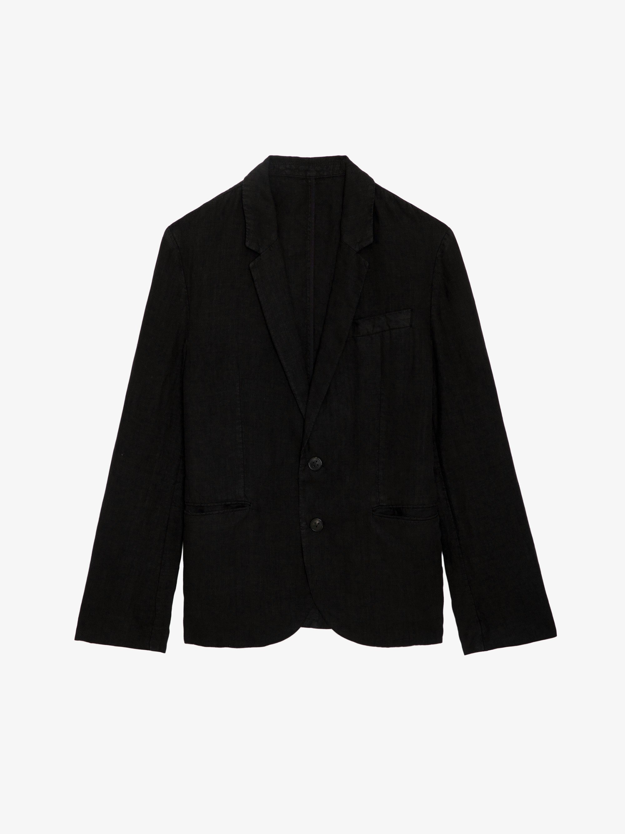 Black washed linen structured blazer with button closure and pockets. Description & details - Men’s black washed linen structured blazer - Tailored collar and ZV button closure - Piped chest pocket and 2 flap pockets - Long sleeves and notched cuffs - Made in Portugal Model is 186 cm / 6' 1" and is wearing a size M This item is true to size. We recommend buying your usual size. Composition 100% LINEN Care This garment should be dry-cleaned only. Product code: WMBL00160_NOIR