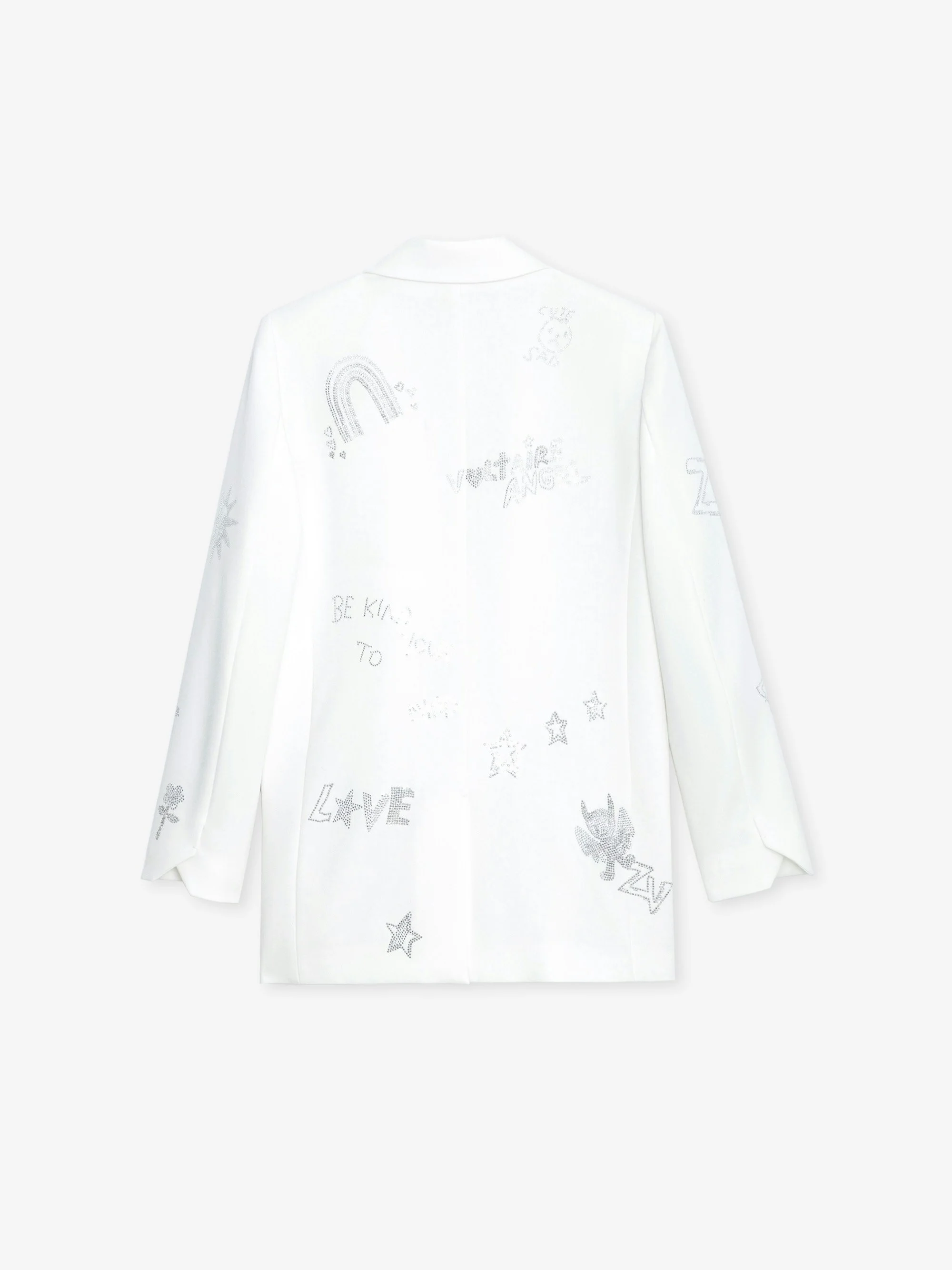 Women's white blazer with customized diamanté details designed by Humberto Cruz. Description & details Customized details designed by Humberto Cruz, an artist and illustrator from San Diego. Influenced by pop culture, fashion and colors, he describes his work as spontaneous and quirky. - Women’s white blazer - 1 button closure - Rhinestone details - 2 flap pockets - Long sleeves - Slit in the back Model is 174 cm / 5' 8" and is wearing a size S This item is true to size. We recommend buying your usual size. Composition 69% POLYESTER 23% VISCOSE 8% ELASTHANNE Care This garment should be dry-cleaned only. Product code: WWBL00841_JUDO