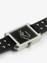 Stainless steel watch with leather strap adorned with studs. Description & details Stainless steel case and bezel - 100% Calf leather band - Studded detail on band - Wrap around style with belt loop closure - Wings design on face Composition 50% Calf leather 50% Steel Product code: OWWT00132_BLACK
