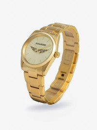 Stainless steel watch with gold dial featuring butterfly and steel bracelet. Description & details - Stainless steel watch - Round case diameter 33 mm, gold dial with butterfly - Quartz movement - Functions: hour/minute - Water resistant to 5 bar - Steel bracelet Composition 100% Steel Care - Clean you jewellery with a soft, dry cloth - Avoid contact with water and chemicals (fragrance, cosmetics, chlorine, hydroalcoholic gel) - Protect your jewellery from humidity and any source of heat - Avoid sleeping with your jewellery on - Store your jewellery in its protective pouch Product code: OWWT00008_GOLD