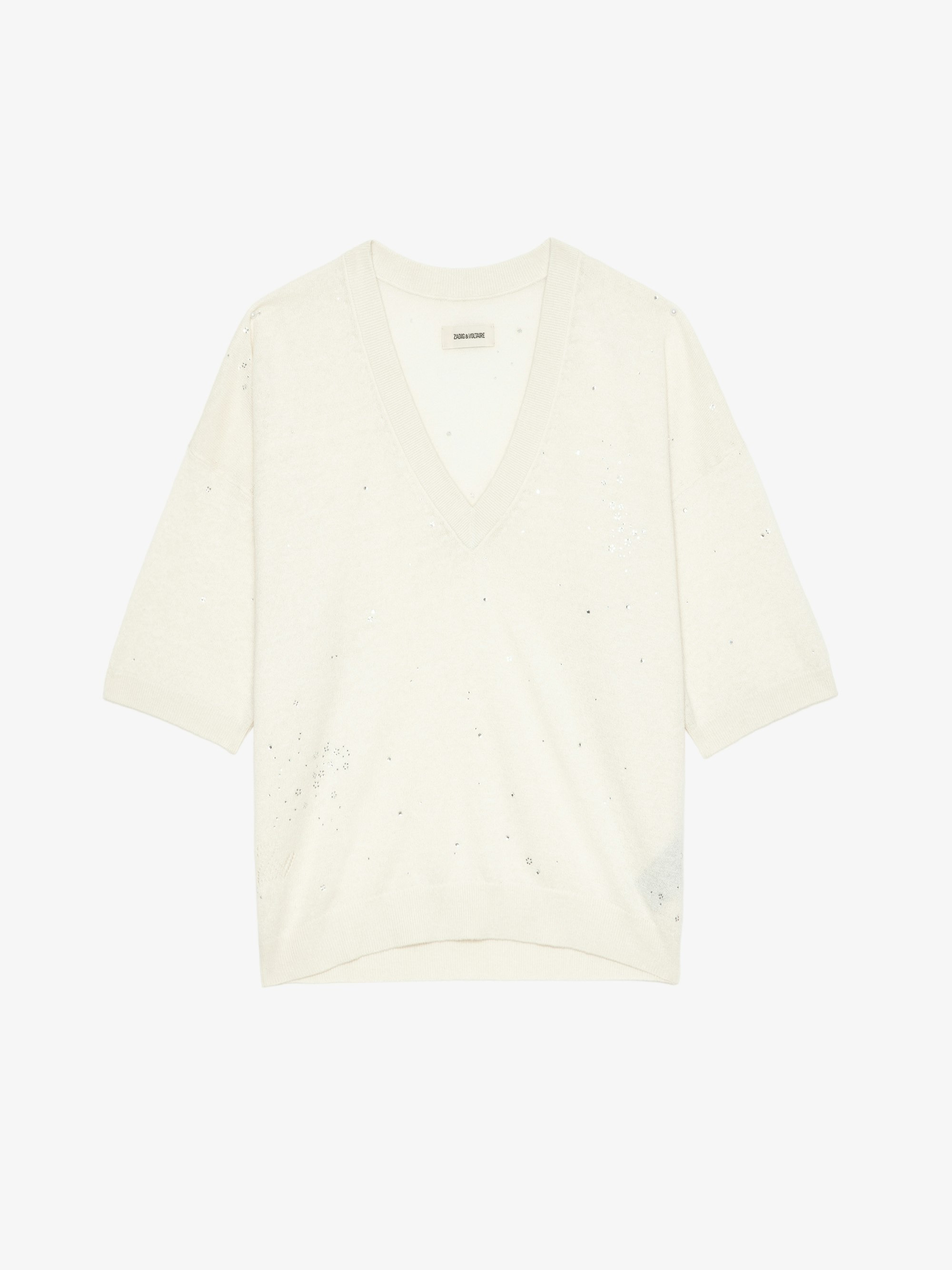 Cozy meets cool with a touch of sparkle. This ultra-soft white rhinestone sweater wraps you in effortless warmth without losing its edge. Shimmering crystal accents trace the neckline and scatter across the front, delivering refined, rock-chic glamour. A clean V neck and short sleeves let the white rhinestone sweater layer under leather or stand alone over denim, carrying laid-back polish from crisp mornings to late-night sets. Description & details - Ultra-soft cotton-blend white rhinestone sweater with a subtly brushed feel - Hand-set rhinestones along the V neckline and body add understated shine - Short sleeves with ribbed cuffs and a ZV pointelle signature at the hem - Relaxed, hip-grazing silhouette styles, loose or lightly tucked for versatility - Straight ribbed hem keeps the fit neat while allowing easy layering Model is 177 cm / 5' 9" and is wearing a size S This item is true to size. We recommend buying your usual size. Composition 50% Linen 36% Cotton** 14% Polyamide Care - Hand-wash or machine-wash on a 20°C wool cycle with a maximum spin speed of 400 rpm - Do not wring - Air dry flat - Iron inside out at a maximum of 110°C, avoiding any customised details Product code: KWSW02775_ECRU