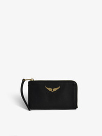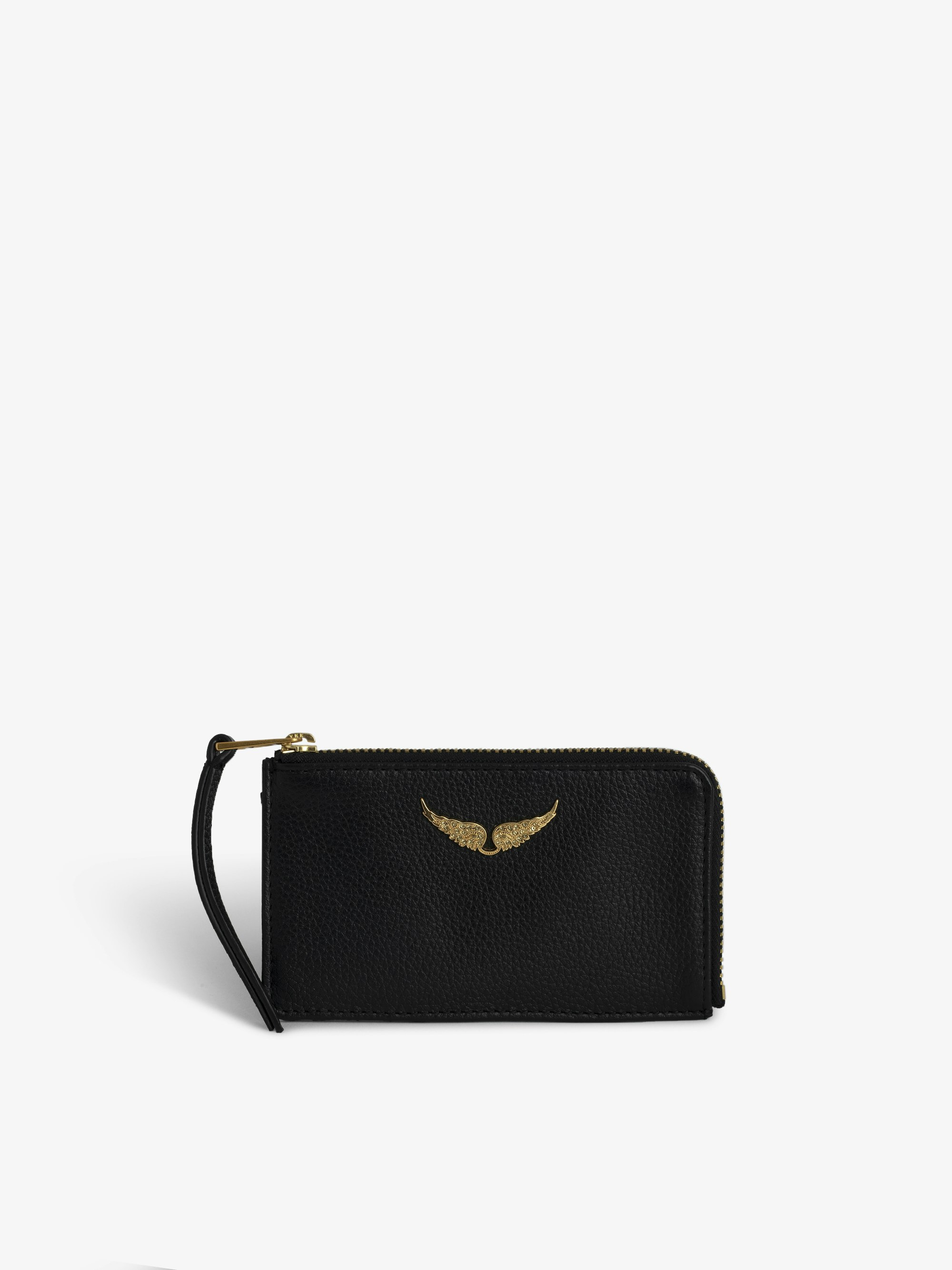 Women’s black grained leather card holder with studded trim and wings charm. Description & details - Women’s ZV card holder in black and gold grained leather - Studded trim and gold diamante wings charm - 4 card slots - 1 flat pocket and 1 zipped pocket - Embossed Zadig&Voltaire branding Width x Height : 13,5 x 7 cm Composition 100% Cow leather Care Do not expose your item to a source of heat or to sunlight for a prolonged period. In the event of accidental exposure to water, leave your item to dry at room temperature, away from direct light. Avoid routinely overloading your handbag or clutch. To prolong its life, store your item in a dust bag and pad it with tissue paper to maintain its shape. To maintain the shine of your smooth or grained leather item, use a leather cream or polish. Product code: LWSG00011_BLACK GOLD