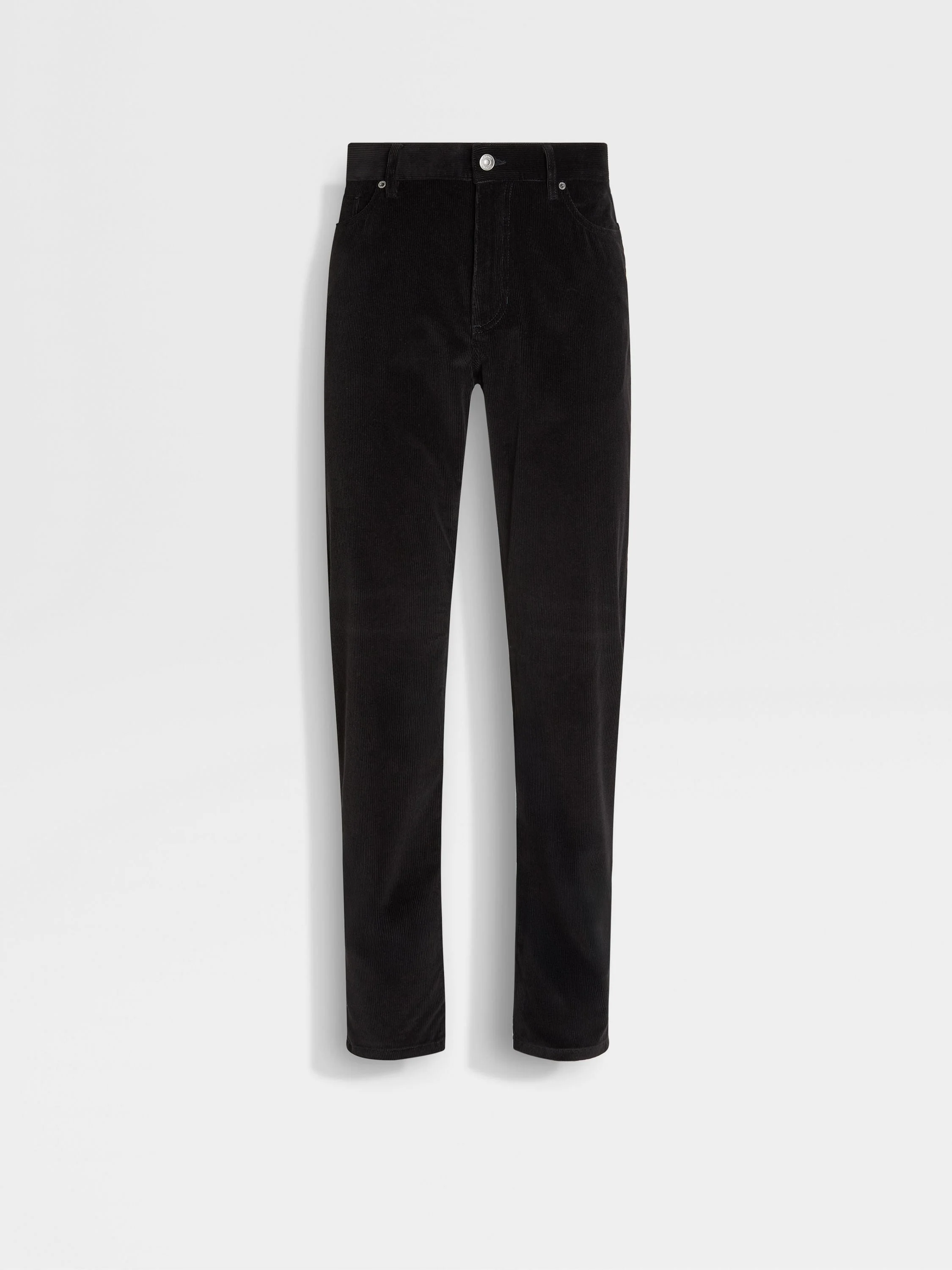 Black Cashco corduroy reimagines ZEGNA's iconic Roccia jeans with soft elegance. INFO ZEGNA's signature blend of cotton and cashmere takes our iconic Cashco Roccia jeans to new levels of luxury, reinterpreted with the sumptuous feel of soft ribbed corduroy. Presented in classic black, this pair is cut in a slim fit for a sleek, streamlined look. ROCCIA ('rɔt:ʃa) — ITALIAN FOR 'ROCK' The inspiration for the Roccia Trousers was Born in Oasi Zegna, the home of our values in the Italian Alps. Inspired by classic workwear, they're both hardwearing and elegant, making them a reliable foundation to any look. PRODUCT CODE UGP21A2-CITY-504 MATERIALS AND CARE Main body: 91% Cotton; 8% Cashmere; 1% Elastane Lining: 65% Polyester; 35% Cotton This garment is crafted from a luxurious blend of cashmere and cotton for exceptional softness and breathability. Max washing temp 30°C, mild process. Do not bleach. Do not tumble dry. Line drying in the shade. Iron at max 110°C. Do not dry clean. Wash inside out. Wash separately. FIT AND PRODUCT DETAILS • Slim fit • 18 cm narrow hem • 5-pocket style • Corduroy • Zip and button closure • Denim weight: 12 ounces