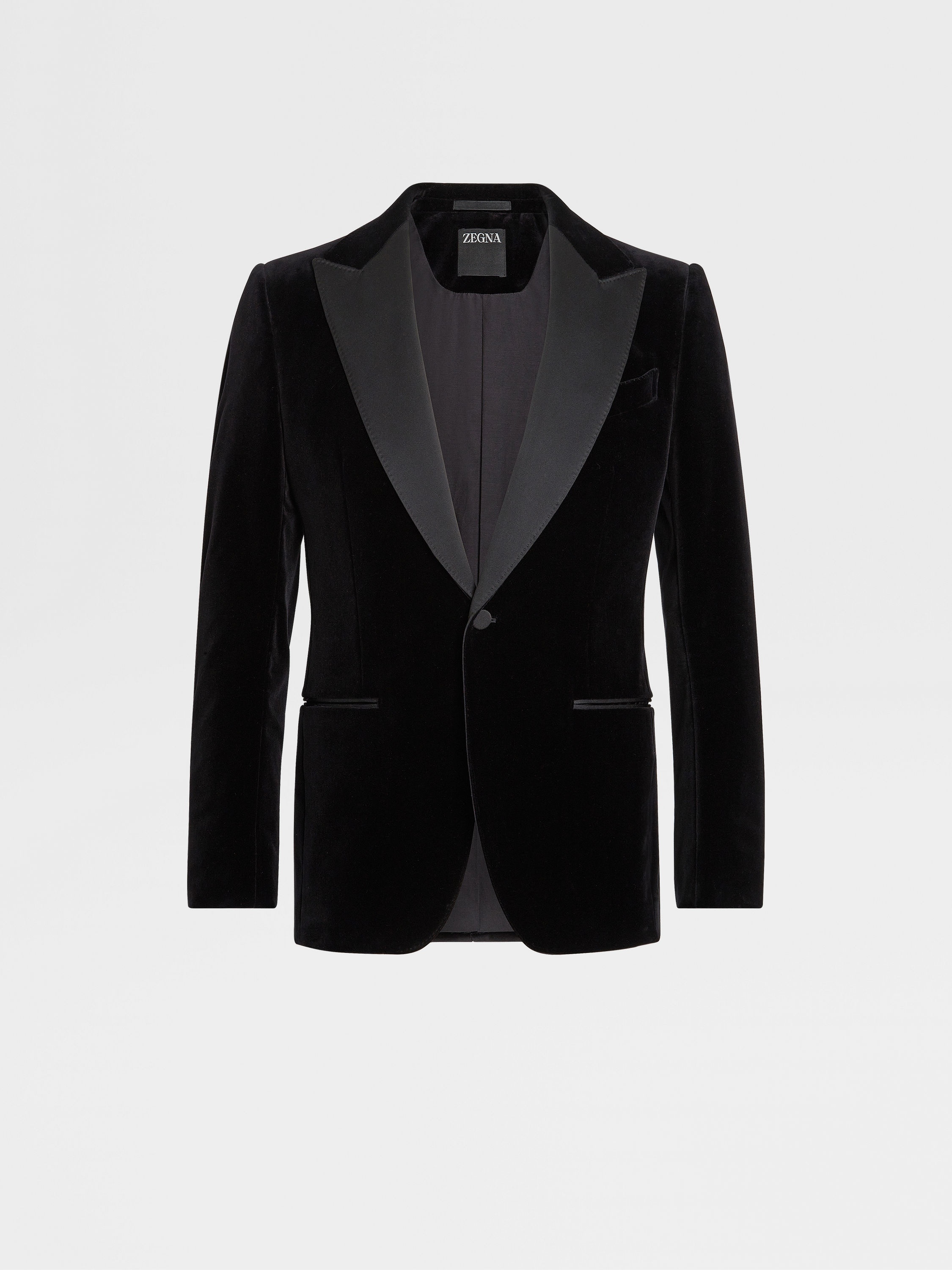 Add a refined texture element with the cotton velvet tailoring evening jacket. INFO The black pure cotton velvet tailoring evening jacket's plush finish makes a luxurious impression at elegant occasions. Thanks to pure cotton's soft and breathable qualities, this plush jacket feels comfortable all night long. Satin details contrast discreetly with the main body. Customize this item with our Made to Measure Service. For more information, please contact our Customer Care or visit your nearest stores. PRODUCT CODE 671E01A6-11EWN0 MATERIALS AND CARE 100% Cotton Do not wash. Do not bleach. Do not tumble dry. Iron at max 110°C. Professional dry cleaning in tetrachloroethene and hydrocarbons, mild process. FIT AND PRODUCT DETAILS • Regular fit • Drop 7 • Tailoring jacket • Double vents • Satin peak lapels • Satin details • Button closure • Welt pockets • Canvas construction • Lined • 74 cm length on size 48 • Model is 185 cm tall (6 feet) and wears an Italian size 48.