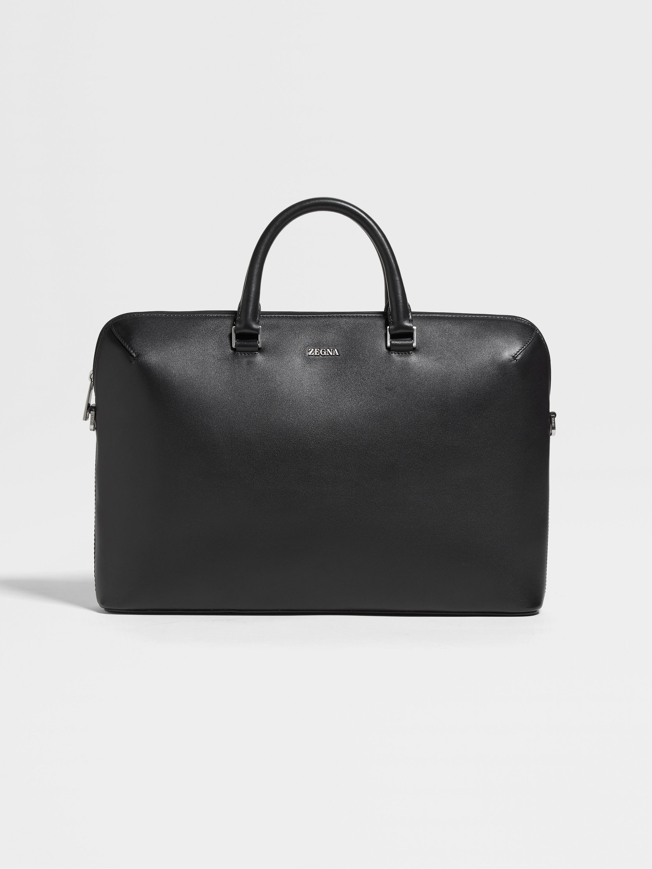 The black leather business bag keeps your documents and electronics secure. INFO The black leather business bag is made from pure calf leather and set off with glazed silver finishes. This sleek business bag is ideal for travel or for busy days around town. It zips shut and is lined with durable, dark grey polyester. PRODUCT CODE LHGRN-C2157Z-NER MATERIALS AND CARE Main body: Calf Leather Lining: Polyester Protect from moisture and do not place near direct sources of heat. Clean with a soft cloth. Do not use solvents or polishes. Avoid contact with cosmetics, perfumes and hand lotions and sanitizers. Store in a cool, dry, well-ventilated place. Stow in the included dust bag when not in use. FIT AND PRODUCT DETAILS • Zip closure • Zegna Logo • Glazed silver finish • Dark grey polyester lining • 40 x 28 x 8 cm / 15.7 x 11 x 3.1 in • Made in Italy