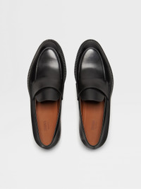 The black leather Torino loafers are hand-buffed, giving them a deep, luminous finish. INFO Combining elegance with contemporary flair, the black leather Torino loafers are effortlessly sophisticated. The slip-on design is crafted from calfskin, with the classic band across the uppers. The toe and heel are reinforced with rubber injections for stability and support. PRODUCT CODE LHCLG-A5658Z-NER MATERIALS AND CARE Hand-buffed Calfskin Clean with a soft cloth. Maintain the leather's glossy appearance by applying a small dab of polish and distributing it uniformly over the surface with a soft cloth. Let dry for a few minutes, then vigorously shine with clean, soft cloth. Avoid contact with abrasives, including hard-bristled brushes, and substances containing alcohol, such as perfumes, solvents, etc. In case of contact with water, it is important to let the footwear dry completely before cleaning. Store in the included dust bag in a cool, dry place. FIT AND PRODUCT DETAILS • Hand-buffed calfskin • Band on the upper • Blake construction • Foliage-colored leather lining • Leather outsole • Rubber inserts at toe and heel • Made in Italy • Fits true to size • Comes with a shoe bag