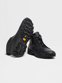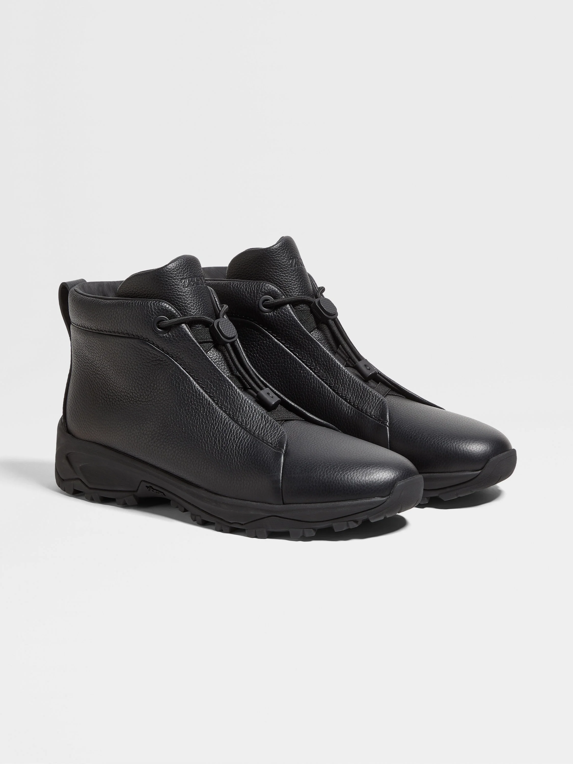 A supportive high-top silhouette in sleek black leather: explore new terrain in these Triple Stitch™ Vetta sneakers. INFO Crafted from Nero Oasi leather, these Triple Stitch™ Vetta sneakers epitomize the concept of sporty elegance. Their high-top silhouette draws inspiration from classic ankle boots, elevated with a drawstring at the ankle and a Vibram® Arctic Grip All Terrain sole for increased support, stability and traction. Signature triple-crossed elastics keep them secure while paying tribute to ZEGNA's legacy of fine tailoring. Nero Oasi (Nerō) – ITALIAN FOR 'BLACK', this is the colour of magnetite, a stone charged with magnetic force that's found in Oasi Zegna. The tone is identified as matte black. VETTA ('vet:a) – ITALIAN FOR 'PEAK' Inspired by the trails of Oasi Zegna, the Triple Stitch™ Vetta shoes hybridise hiking and sporting styles. An evolution of the iconic Triple Stitch™ Luxury Leisurewear shoe, they're hallmarked with a trio of crosses that are inspired by the handmade stitches found on our jackets, then set on a Vibram® Arctic Grip™ sole that provides increased traction for outdoor pursuits. PRODUCT CODE LHSOF-S8142Z-NER MATERIALS AND CARE Calfskin; Polyurethane The innovative Vibram® Arctic Grip All Terrain sole of these shoes ensures exceptional grip but does not eliminate the risk of slipping on certain surfaces, nor does it replace the use of crampons or spikes. Additionally, we recommend caution when wearing them indoors, as the sole may potentially harm delicate flooring such as wood or tile. Cherish your shoes with care to allow their story to unfold in elegance. Gently wipe your shoes with a soft cloth to preserve their refined finish. Lighter leathers, in particular, may be marked by repeated contact with darker fabrics, so handle with mindful attention. Avoid contact with water, oily substances, and alcohol-based products such as perfumes or solvents, as well as any abrasive materials that may damage the surface. Should they come into contact with moisture, allow them to dry fully before resuming any care routine. Protect your shoes from prolonged exposure to direct sunlight or artificial light to maintain their natural color and texture. Alternate their use to extend their life and ensure they retain their impeccable shape by filling them with shoe trees or soft tissue paper when not in use. Be sure to store your shoes in the fabric bags provided, in a cool, dry place. To preserve the quality of your Triple Stitch™ Vetta, we recommend using our exclusive Care Kit. FIT AND PRODUCT DETAILS • Crossed elastics • Adjustable drawstring at the ankle • Functional loop on the back • Foliage-colored leather lining • Black Vibram® Arctic Grip All Terrain sole • ZEGNA 232 Road Brand Mark on the heel tab • Sanitized® removable footbed • Made in Italy • Comes with a shoe bag We want every pair of Triple Stitch™ sneakers to fit perfectly anytime, anywhere, anyplace. To find your perfect fit, we recommend going down a half-size compared to your usual shoe size. Please note that ZEGNA uses UK sizing. For further information, please contact us via our customer service channels or by visiting the nearest ZEGNA flagship store.