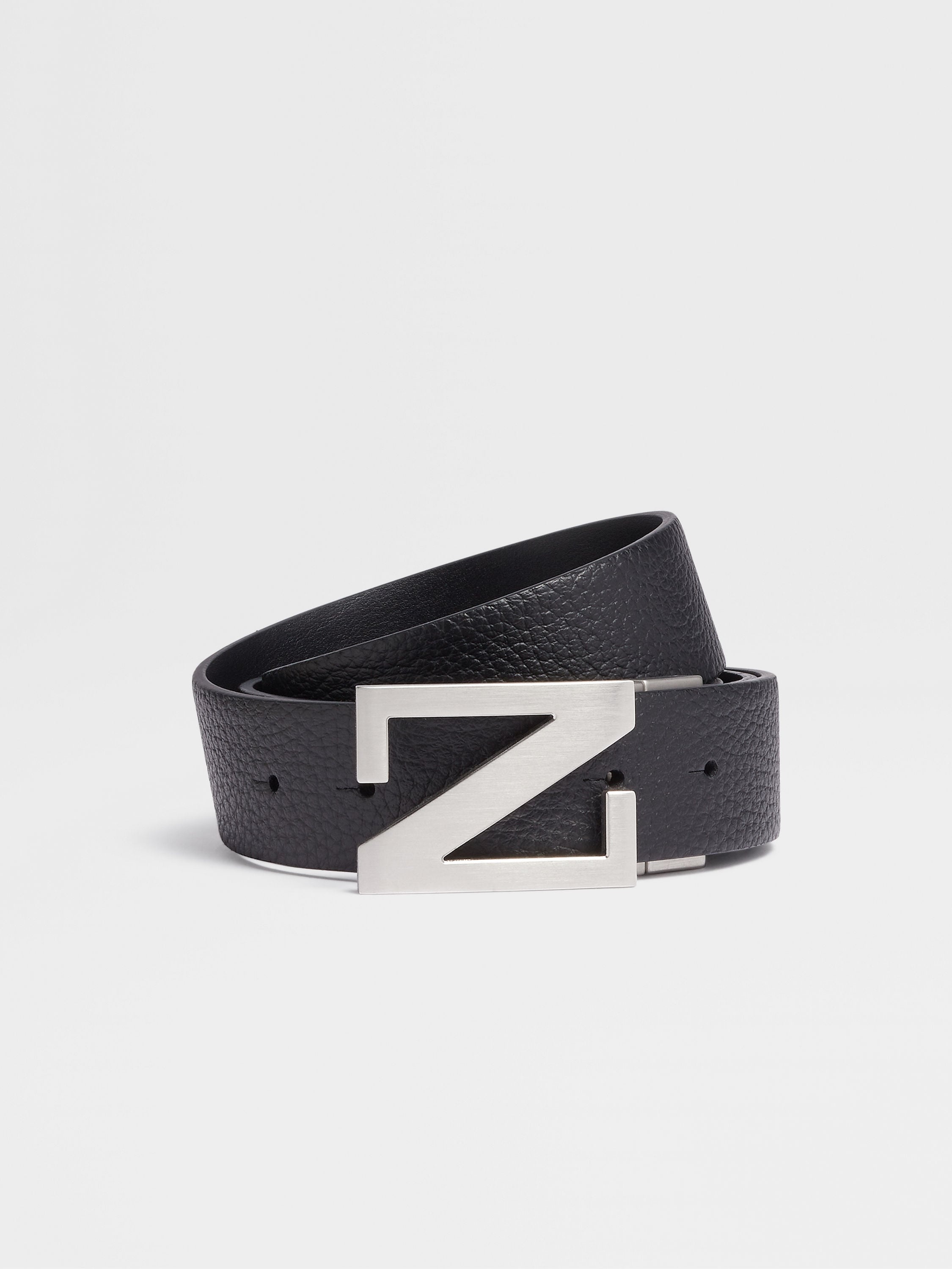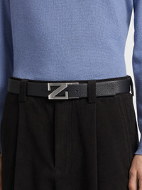 The black reversible leather belt in grained and smooth leather offers versatile styling options. INFO Choose between the reversible belt's two sides to complement a variety of outfits: smooth black leather is a timeless choice, while the grained side adds a rugged element of texture to any look. The Zegna Monogram buckle adds a final flourish. PRODUCT CODE LHBOV-B027AZ-NER MATERIALS AND CARE Grained Calfskin; Calfskin Protect from moisture and do not place near direct sources of heat. Clean with a soft cloth. Do not use solvents or polishes. Avoid contact with cosmetics, perfumes and hand lotions and sanitizers. Store in a cool, dry, well-ventilated place. Stow in the included dust bag when not in use. FIT AND PRODUCT DETAILS • Zegna Monogram buckle • Metal buckle with glazed silver finish • Width: 3.5 cm / 1.4 in • Fully adjustable • Reversible belt • Front in black grained calfskin, reverse in black calfskin • Made in Italy