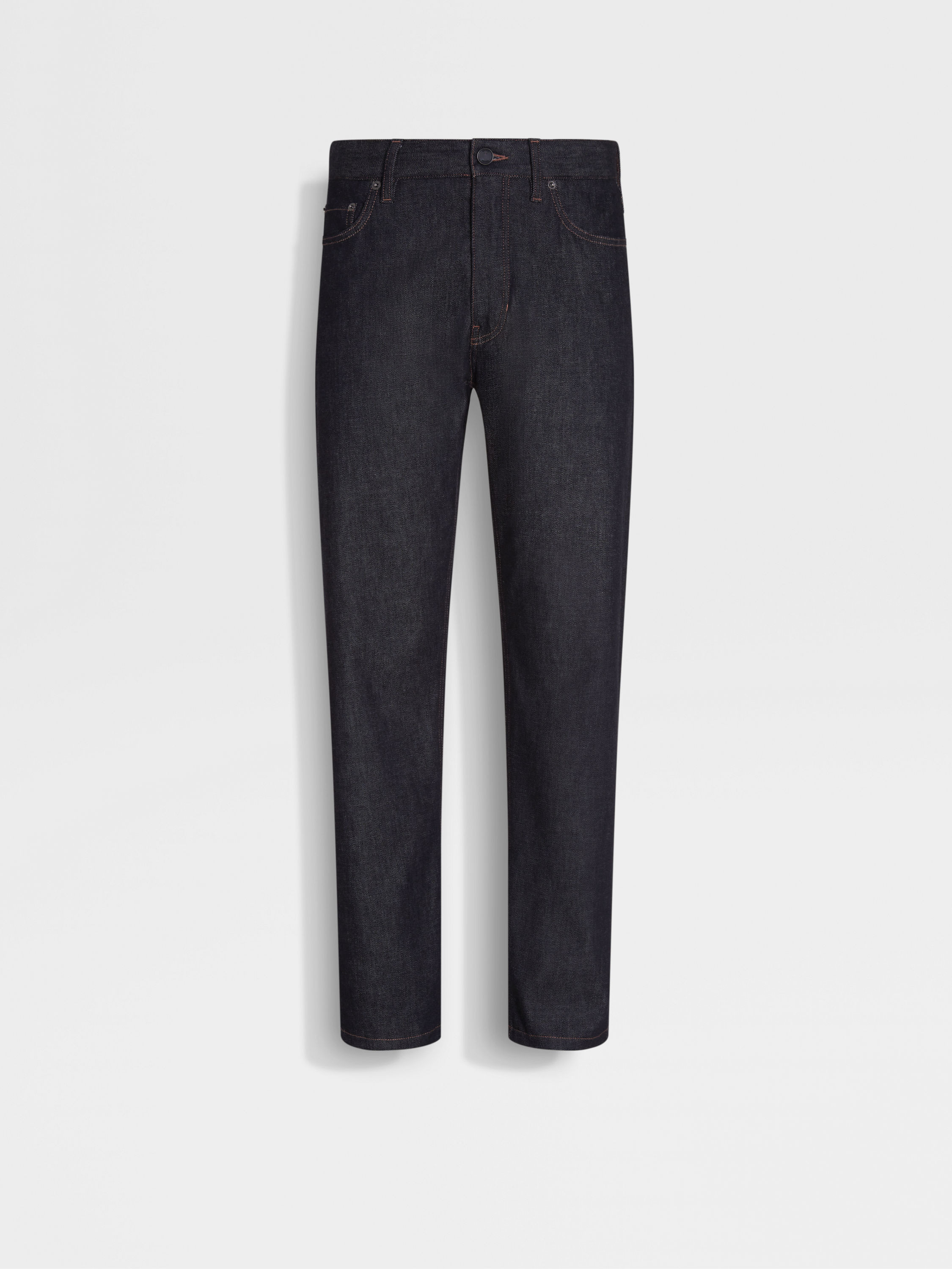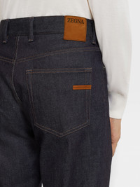 These blue cotton-cashmere Roccia jeans are infused with stretch for comfort. INFO Comfort meets style to create these blue Roccia jeans, crafted from refined cotton-cashmere denim with the perfect hint of stretch. Their slim-fit silhouette is styled with an inner sartorial waistband in line with ZEGNA's vision of elevated leisurewear. ROCCIA ('rɔt:ʃa) — ITALIAN FOR 'ROCK' The inspiration for the Roccia Trousers was Born in Oasi Zegna, the home of our values in the Italian Alps. Inspired by classic workwear, they're both hardwearing and elegant, making them a reliable foundation to any look. PRODUCT CODE UGL99A2-CITYS-B01 MATERIALS AND CARE Main body: 93% Cotton; 6% Cashmere; 1% Elastane Lining: 65% Polyester; 35% Cotton Do not wash. Do not bleach. Do not tumble dry. Iron at max 110°C. Professional dry cleaning in hydrocarbons, mild process. FIT AND PRODUCT DETAILS • Slim fit • 18 cm narrow hem • Zip and button closure • 5-pocket style • Inner sartorial waistband • Denim weight: 10 ounces