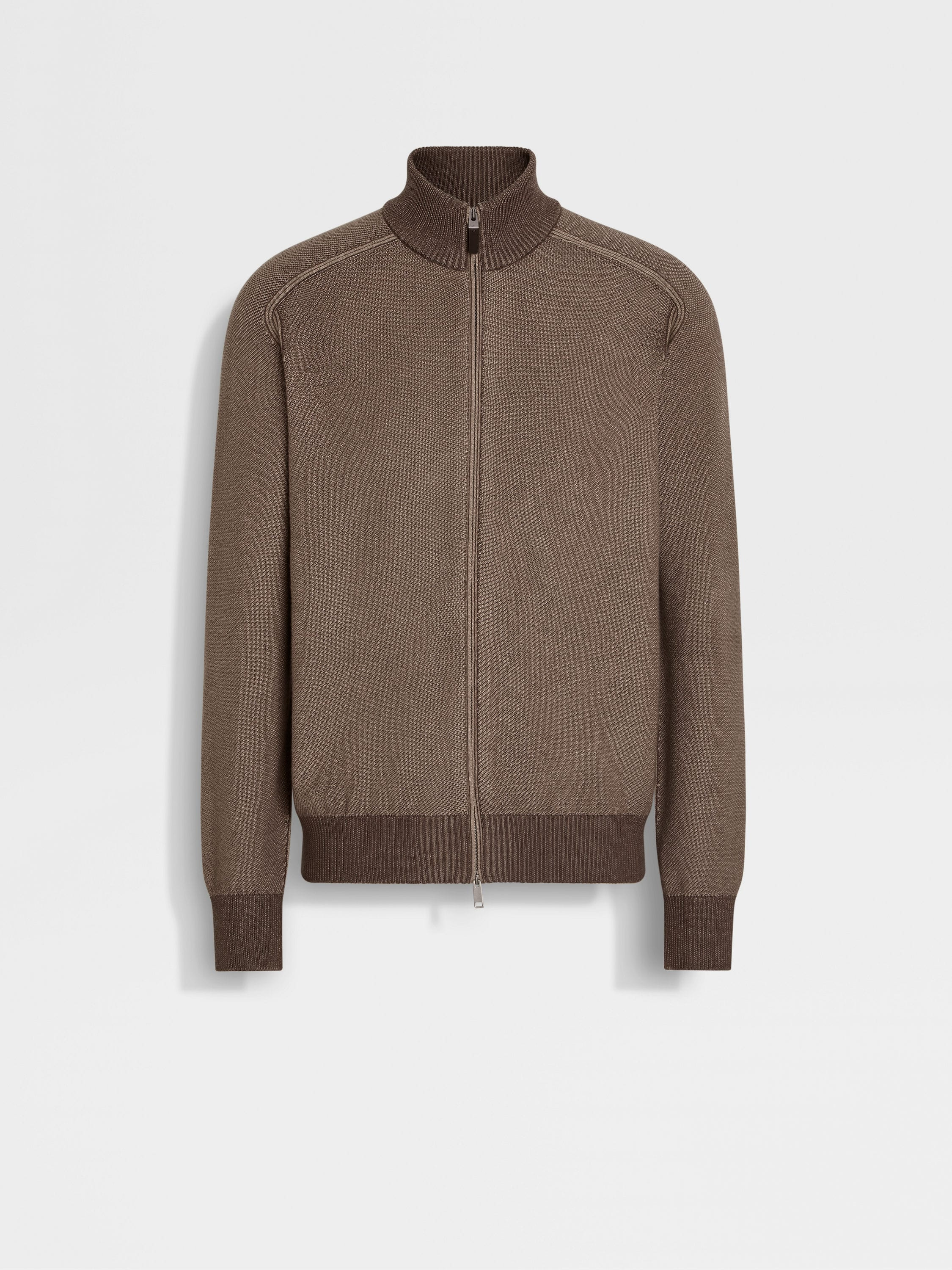 This brown and light taupe full-zip cardigan elevates a leisurewear staple in ZEGNA's luxurious Cashseta fabric. INFO The very best of cashmere and silk. This zip-through cardigan is knit with a brown and light taupe jacquard design from ZEGNA's luxurious Cashseta: an exclusive fabric that's been yarn-dyed to create a distinctive melange finish with subtle variations in each garment. Edged with snug ribbed trims. PRODUCT CODE UGJ92A2-157-155 MATERIALS AND CARE 70% Cashmere; 30% Mulberry Silk This sophisticated fabric combines the softness of cashmere with the smooth finish of fine silk. The yarns of Cashseta are dyed before the fabric is created, resulting in a melange that is unique to each garment. Do not wash. Do not bleach. Do not tumble dry. Iron at max 110°C. Professional dry cleaning in hydrocarbons, mild process. FIT AND PRODUCT DETAILS • Regular fit • 18 gauge • Ribbed stand collar • Long sleeves • Ribbed hem and cuffs • Zip closure • Bicolor jacquard knit