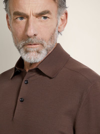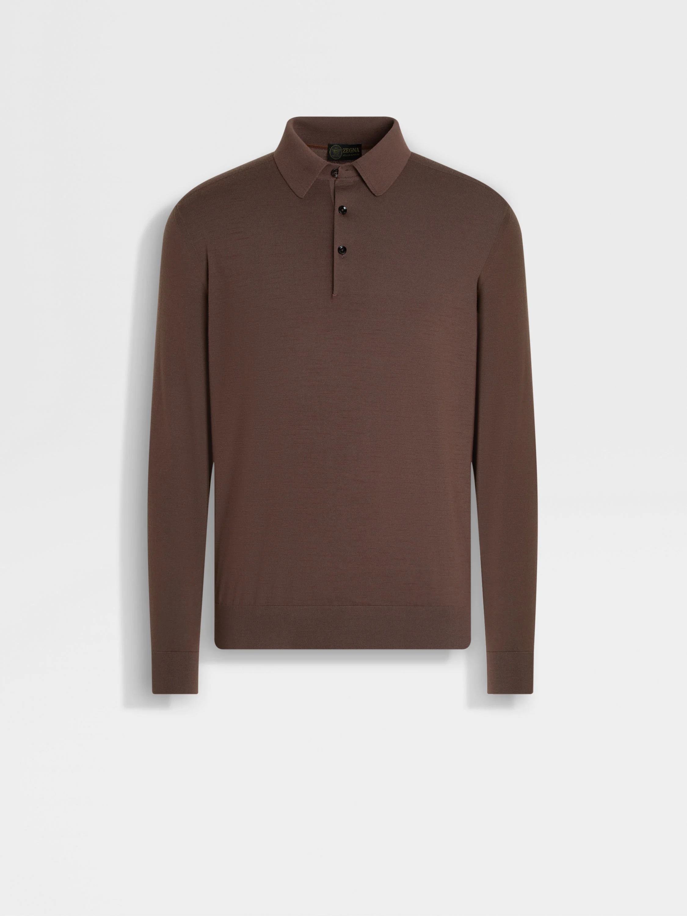 The authentic beauty of ZEGNA's Vellus Aureum elevates this brown polo shirt to luxury status. INFO This brown Vellus Aureum polo shirt is an emblem of everyday luxury. Knitted from exceptionally soft wool, it features long-sleeves, a classic button placket and a ribbed collar: a polished choice for formal and casual occasions alike. PRODUCT CODE UGA00A2-VELPOL-M06 MATERIALS AND CARE 100% Wool Vellus Aureum was inspired by our Founder’s quest for excellence to seek the finest wool in the world. Exquisitely fine in texture and rare, Vellus Aureum is crafted from 100% certified traceable wool fibres. Wash by hand. Do not bleach. Do not tumble dry. Flat drying. Iron at max 110°C. Professional dry cleaning in hydrocarbons, mild process. Wash and iron inside out. Protect buttons before cleaning. FIT AND PRODUCT DETAILS • Regular fit • 21 gauge • Ribbed polo collar • Long sleeves • Ribbed hem and cuffs • Button closure