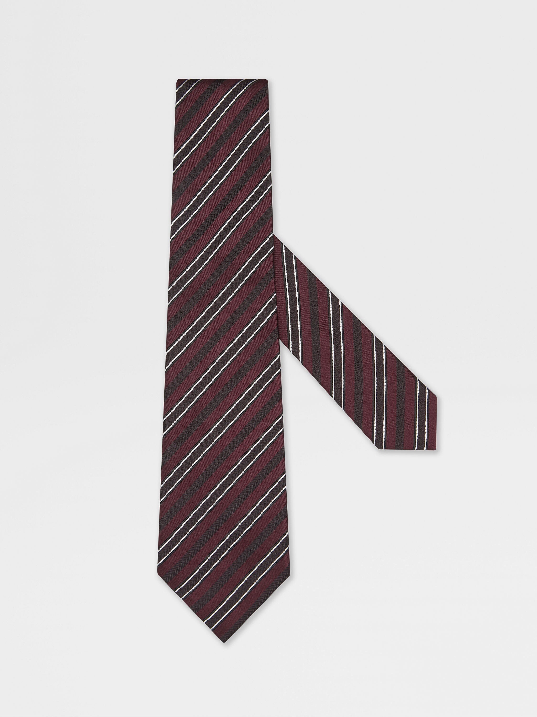 This burgundy striped tie is crafted from a refined blend of silk and cotton. INFO This jacquard tie is crafted from a sophisticated cotton and silk blend, providing a sublime backdrop for a burgundy striped pattern. A refined addition to office-to-evening looks. PRODUCT CODE Z9C15TA9-1PC-BU1 MATERIALS AND CARE Main body: 93% Mulberry Silk; 7% Cotton; Lining: 93% Mulberry Silk; 7% Cotton Do not wash. Do not bleach. Do not tumble dry. Do not iron. Professional dry cleaning in tetrachloroethene and hydrocarbons, mild process. FIT AND PRODUCT DETAILS • Blade width: 8 cm / 3.1 in • Striped jacquard pattern • Made in Italy