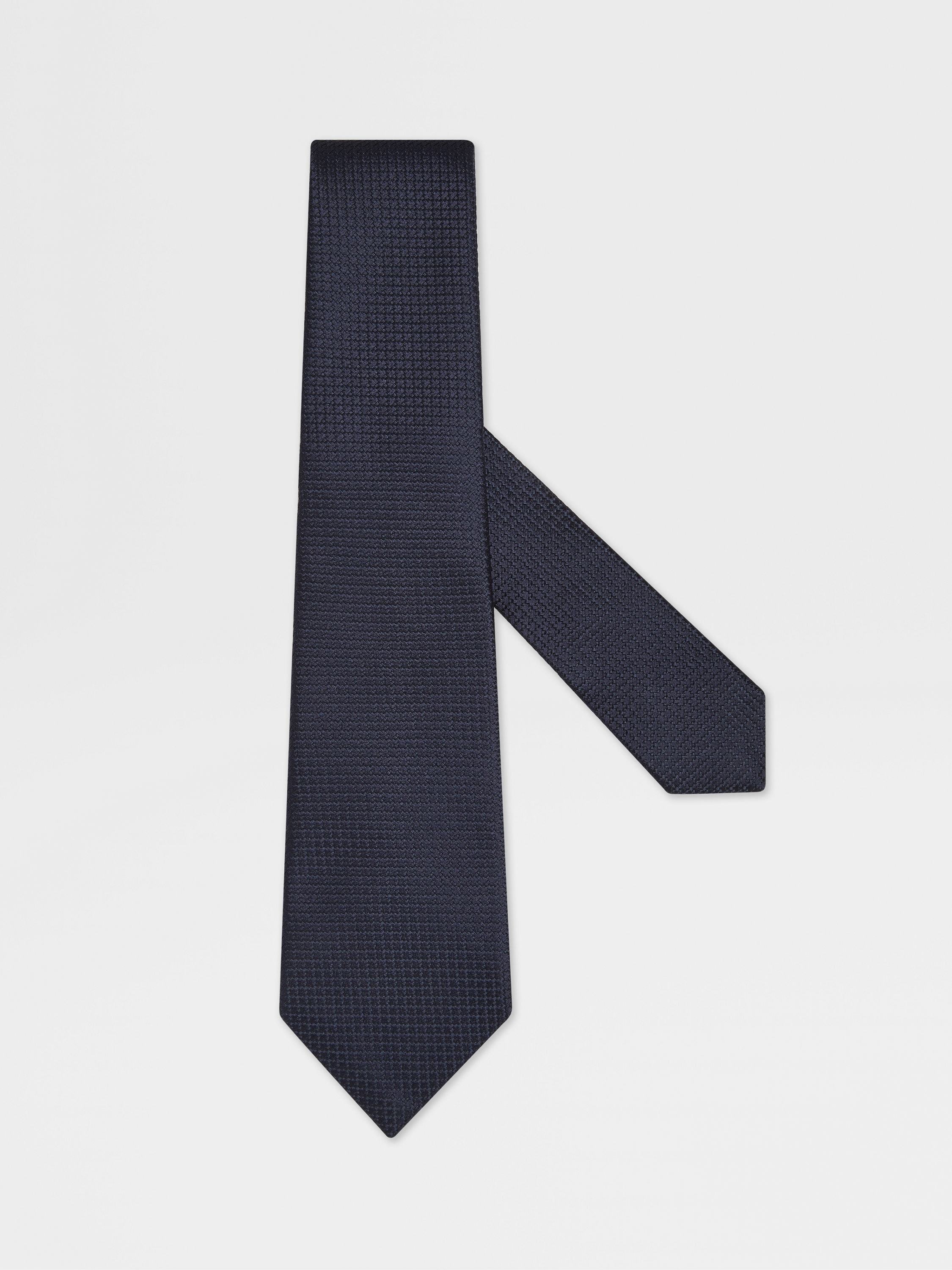 This dark blue jacquard silk tie presents a charming textured pattern. INFO Crafted from pure Mulberry silk, this jacquard tie is designed with a dynamic textured pattern in a dark blue colorway. An effortlessly elegant addition to your next evening ensemble. PRODUCT CODE Z2C30TA2-1PC-BL1 MATERIALS AND CARE Main body: 100% Mulberry Silk Lining: 100% Mulberry Silk Do not wash. Do not bleach. Do not tumble dry. Do not iron. Professional dry cleaning in tetrachloroethene and hydrocarbons, mild process. FIT AND PRODUCT DETAILS • Blade width: 8 cm / 3.1 in • Textured jacquard pattern