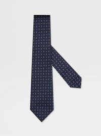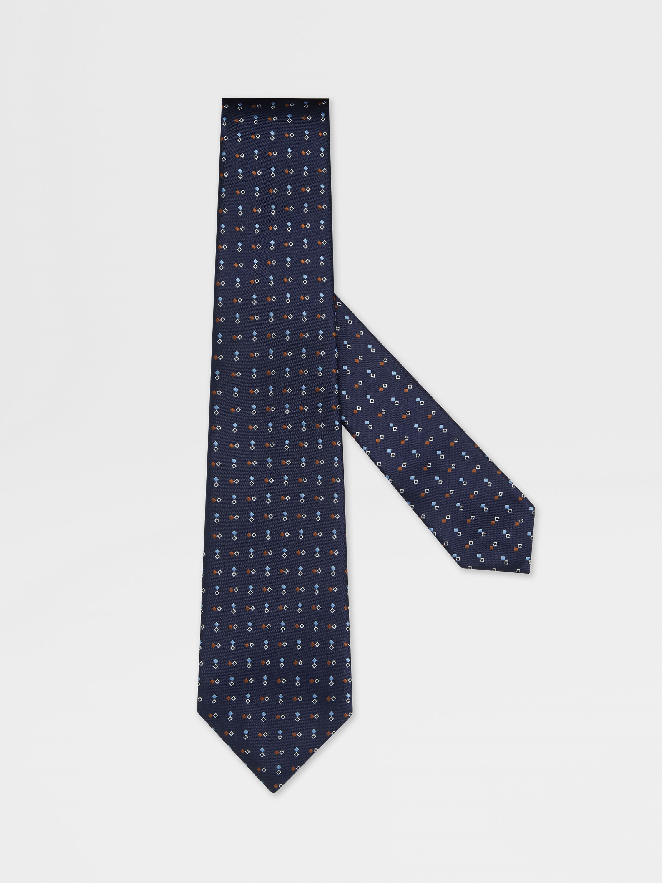 From office to evening, this dark blue silk tie with micro-geometric jacquard pattern is a formal essential. INFO Featuring an intricate micro-geometric pattern, this dark blue jacquard tie makes an elegant addition to all kinds of smart ensembles. Crafted from pure Mulberry silk. PRODUCT CODE Z2C43TA2-1PC-BL1 MATERIALS AND CARE Main body: 100% Mulberry Silk Lining: 100% Mulberry Silk Do not wash. Do not bleach. Do not tumble dry. Do not iron. Professional dry cleaning in tetrachloroethene and hydrocarbons, mild process. FIT AND PRODUCT DETAILS • Blade width: 8 cm / 3.1 in • Micro-geometric jacquard pattern