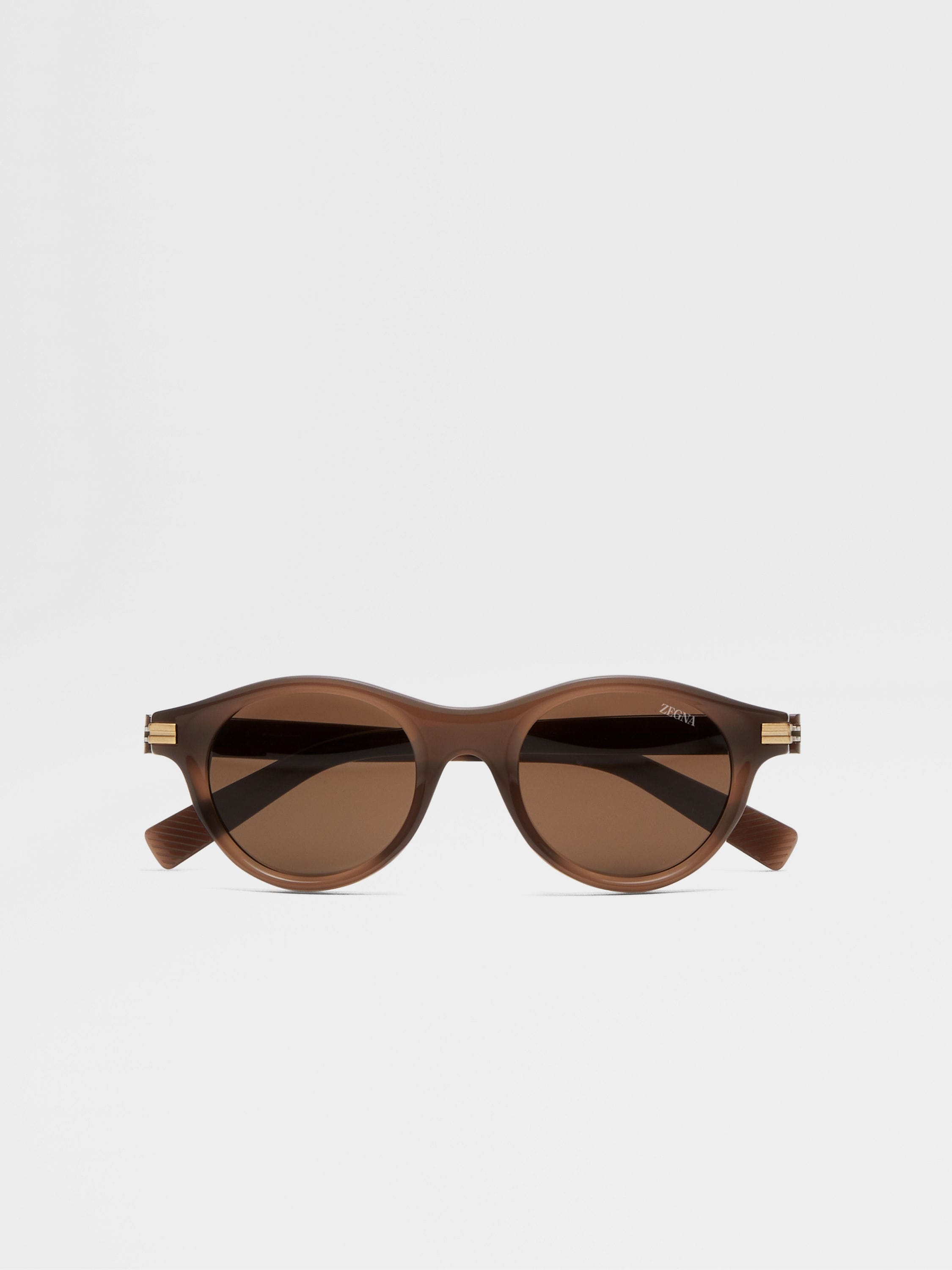 These dark brown acetate sunglasses exude modern elegance with their clean silhouette and sinuous curves. INFO A combination of sleek shiny acetate and sinuously rounded volumes give these sunglasses a refined contemporary feel. Our iconic Zegna 232 Road Brand Mark on the corners in bold metal sets off their elegant dark brown colourway. These single-bridge frames come with clear lenses that can be worn both inside and outside for everyday versatility. PRODUCT CODE EZ0271-4848E MATERIALS AND CARE Full Acetate Clean your eyewear using a soft cloth, preferably microfiber, with water or a mild detergent. To avoid scratching the lenses, never use paper towels or clothing to clean your eyewear. Do not use household detergents or soaps to clean your eyewear; these products will damage the lenses over time. FIT AND PRODUCT DETAILS • Lens 48 mm – Bridge 21 mm – Temple 145 mm • Base 4 • Finishing: shiny • Suitable for mounting prescription lenses • Single bridge • Laser-inscribed Zegna Logo on the lens • Resin-coated Zegna Logo on the inside of the temple • Zegna 232 Road Brand Mark on the temples