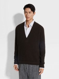 This dark brown V-neck lets the authentic beauty of ZEGNA's signature Oasi Cashmere take center stage. INFO Cozy yet refined in equal parts, this long-sleeved V-neck sweater is crafted from luxuriously soft Oasi Cashmere: one of the brand's most exclusive natural fibers. Knit with a tactile cable stitch and snug ribbed trims. PRODUCT CODE UGSK78A2-VNS-M09 MATERIALS AND CARE 100% Cashmere The inspiration behind this Oasi Cashmere collection garment was born in Oasi Zegna, a 100km² natural territory and the home of our values. It's crafted from Oasi Cashmere fibres, made with 100% certified traceable fibres. The Oasi Cashmere collection follows in the footsteps of our Founder, who envisioned a vertically integrated system of producing textiles. Wash by hand. Do not bleach. Do not tumble dry. Flat drying. Iron at 110°C. Professional dry cleaning in hydrocarbons, mild process. Wash and iron inside out. FIT AND PRODUCT DETAILS • Regular fit • Ribbed V-neck collar • 7 gauge • Ribbed hem and cuffs • Cable stitch