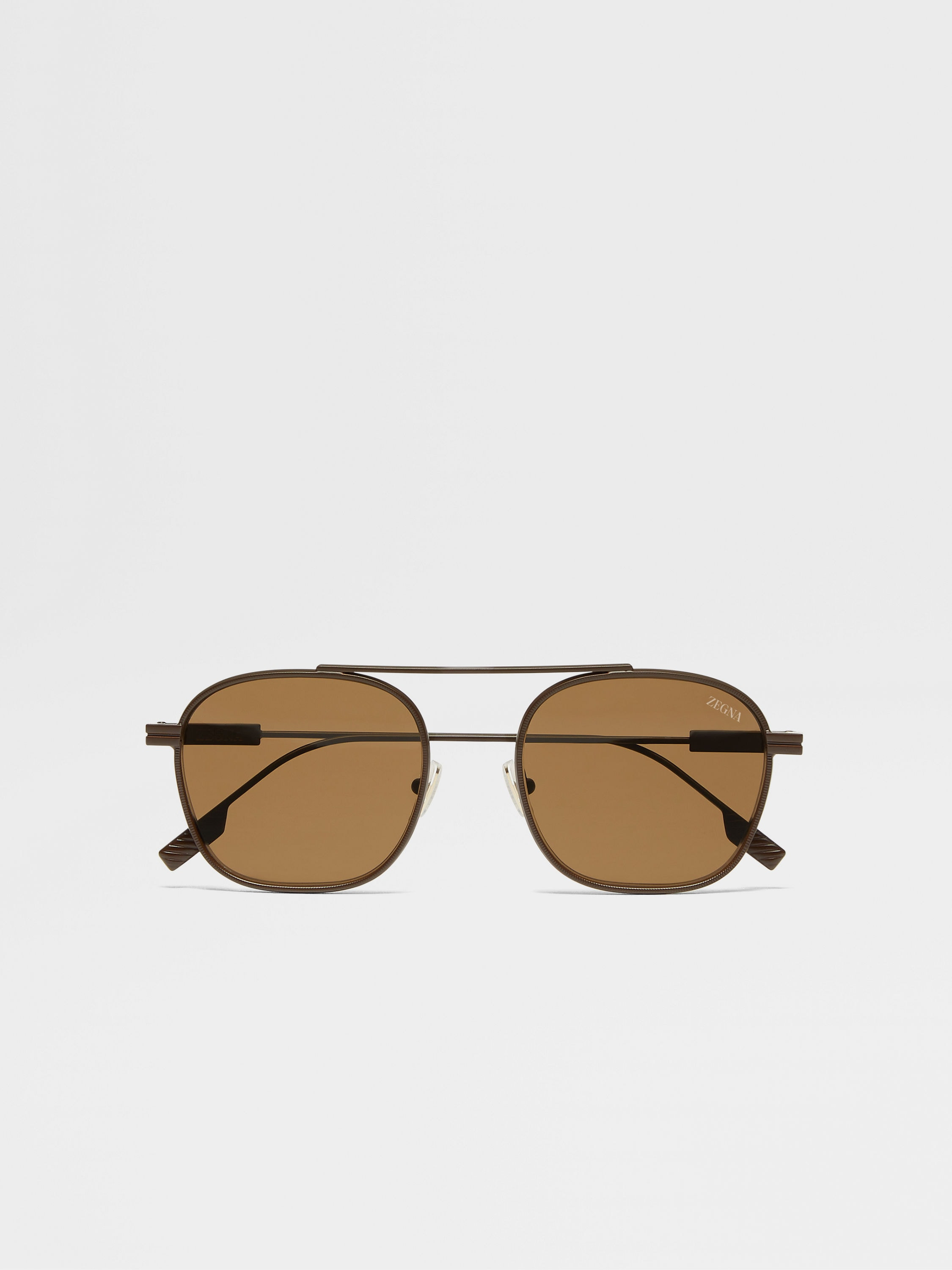 Make a statement in these dark brown Orizzonte I metal sunglasses. INFO These dark brown Orizzonte I sunglasses stand out with a high top-bar construction that seems to float on the face. A sleek full-metal design, this model is enriched with intricate embossed lines that bring depth and texture to the rims. Featuring our 232 Road Brand Mark on the temples for a signature touch, their soft round silhouette is elevated with adjustable palladium nosepads and high-grip paddle tips for enhanced comfort and functionality. A shiny deep gold internal rim outline and roviex lenses add a refined contrast and complete the look. ORIZZONTE (oridˈdzonte) – ITALIAN FOR 'HORIZON' The inspiration for the Orizzonte I sunglasses was born in Oasi Zegna, the home of ZEGNA’s values in the Italian Alps. Its contemporary and casual bridgeless silhouette is embellished with the iconic 232 Road Brand Mark and the ZEGNA logo. The geometric shape is characterised by the special construction, featuring a high metal top bar that inspired the name ‘Orizzonte’. PRODUCT CODE EZ0290-5349E MATERIALS AND CARE Full Metal Clean your eyewear using a soft cloth, preferably microfiber, with water or a mild detergent. To avoid scratching the lenses, never use paper towels or clothing to clean your eyewear. Do not use household detergents or soaps to clean your eyewear; these products will damage the lenses over time. FIT AND PRODUCT DETAILS • Lens 53 mm – Bridge 21 mm – Temple 145 mm • Base 4 • Finishing: matte • Not suitable for mounting prescription lenses • Single bridge • Roviex lenses • Grip paddle on the end of the temples • Adjustable gold nosepads • ZEGNA 232 Road Brand Mark on the temples as a corner detail • ZEGNA Logo on the lens and on the inner side of the temples