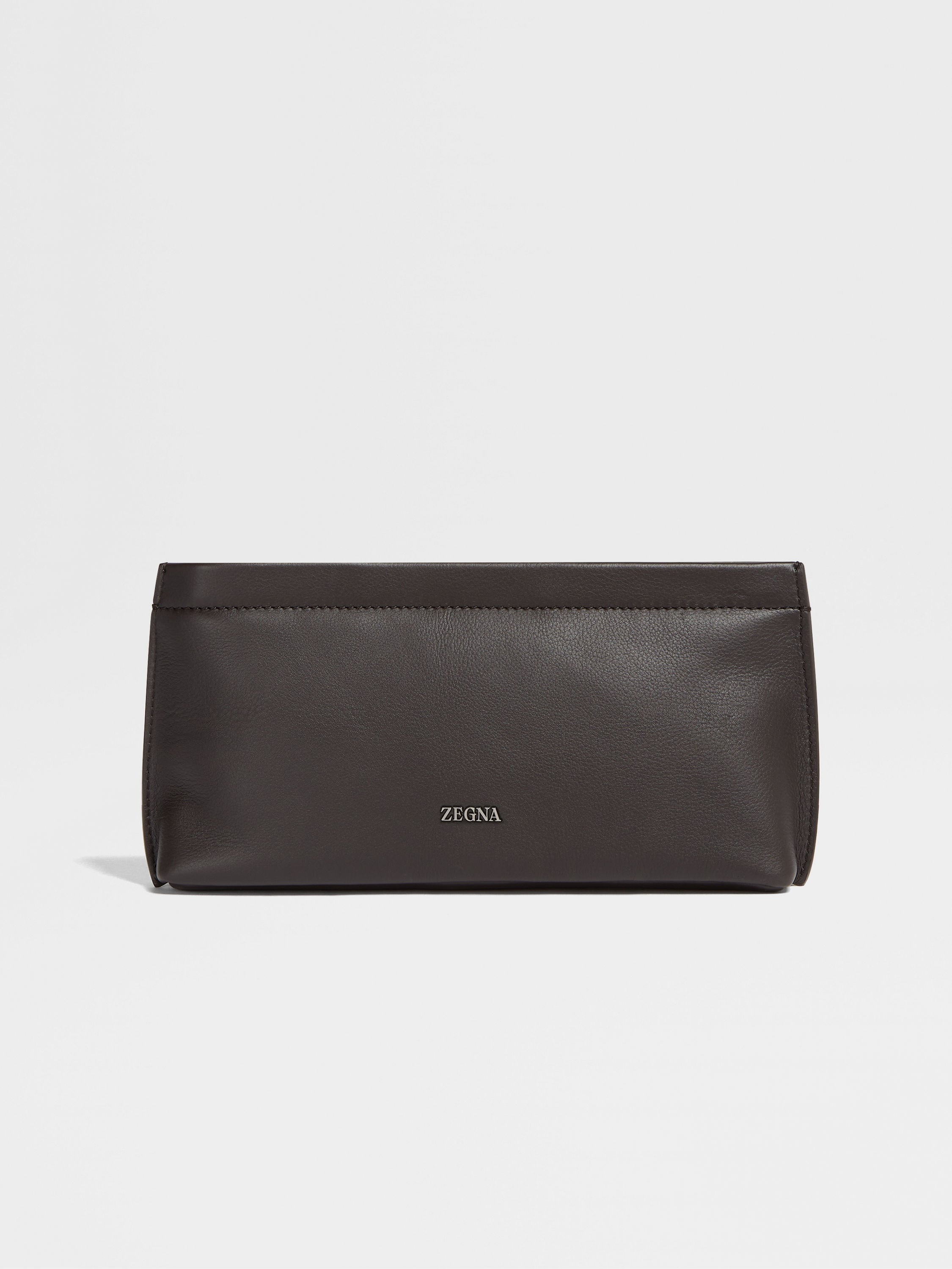 The dark brown SECONDSKIN mini standing clutch is made from super supple calf leather. INFO Thanks to its flexible and resilient exterior, the dark brown SECONDSKIN mini standing clutch adapts to any situation. The vertical design keeps your essentials secure. The soft calf leather clutch is lined with cotton and finished off with polished ultrablack finishes and the Zegna Logo. PRODUCT CODE LHOTO-E1789Z-AMO MATERIALS AND CARE Main body: Calf Leather Lining: 100% Cotton SECONDSKIN is crafted by tanneries selected for their renowned expertise. Fine, supple and incredibly soft to the touch, it moulds to your proportions over time — offering impeccable comfort with each wear. Protect from moisture and do not place near direct sources of heat. Clean with a soft cloth. Do not use solvents or polishes. Avoid contact with cosmetics, perfumes and hand lotions and sanitizers. Store in a cool, dry, well-ventilated place. Stow in the included dust bag when not in use. FIT AND PRODUCT DETAILS • Zegna Logo • Polished ultrablack finish • Grey melange cotton lining • 24 x 12 cm / 9.4 x 4.7 in • Made in Italy