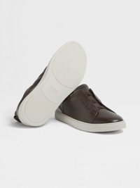 The dark brown SECONDSKIN Triple Stitch™ sneakers perfectly mold to your foot. INFO The dark brown SECONDSKIN Triple Stitch™ sneakers are crafted from specially selected calf leather for even more flexibility. The brand’s signature triple-crossed elastic detail ensures an easy slip-on fit, while evoking the traditional hand-stitching of tailored jackets to symbolize and honor Zegna’s legacy of fine craftsmanship. The super soft, light uppers are complemented by a white rubber sole. Customize these sneakers with our Made to Measure Service. For more information, please contact our Customer Care or visit your nearest stores. PRODUCT CODE LHOTA-S5207Z-CFF MATERIALS AND CARE Calfskin SECONDSKIN is crafted by tanneries selected for their renowned expertise. Fine, supple and incredibly soft to the touch, it moulds to your proportions over time — offering impeccable comfort with each wear. Clean with a soft cloth. Avoid contact with abrasives, water and substances containing alcohol, such as perfumes, solvents, etc. In case of contact with water, it is important to let the footwear dry completely before cleaning. Clean the rubber soles with a product specifically designed for cleaning rubber. Store in the included dust bag in a cool, dry place. FIT AND PRODUCT DETAILS • Crossed elastics • Extra-light white rubber sole • Sanitized® removable footbed • Made in Italy • Comes with a shoe bag We want every pair of Triple Stitch™ sneakers to fit perfectly anytime, anywhere, anyplace. To find your perfect fit, we recommend going down a half-size compared to your usual shoe size. Please note that Zegna uses UK sizing. For further information, please contact us via our customer service channels or by visiting the nearest Zegna flagship store.