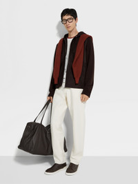 This dark brown wool hoodie is enriched with supple SECONDSKIN leather panels. INFO Indulge in the supple embrace of pure wool and Zegna's ultra-soft yet resilient SECONDSKIN leather with this dark brown hoodie. Its zip-through silhouette is styled with open cuffs and straight side pockets for a sleek look. PRODUCT CODE UF559A9-FCT816-M09 MATERIALS AND CARE Main body: 100% Wool Leather details: Calfskin SECONDSKIN is crafted by tanneries selected for their renowned expertise. Fine, supple and incredibly soft to the touch, it moulds to your proportions over time — offering impeccable comfort with each wear. Do not wash. Do not bleach. Do not tumble dry. Iron at max 110°C. Professional dry cleaning in hydrocarbons. Wash and iron inside out. Professional leather clean only. Avoid prolonged contact with light coloured garments. FIT AND PRODUCT DETAILS • Long sleeves • Hooded collar • Side straight pockets • Half-elasticated hem • Open cuffs • Zip closure • SECONDSKIN front panel, hood, and back yoke • Regular fit