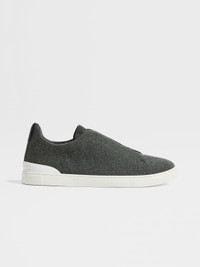 The dark green Triple Stitch™ Oasi Cashmere sneakers offer a softer take on a casual silhouette. INFO Enhanced with nubuck details, the dark green Triple Stitch™ Oasi Cashmere sneakers pair two luxurious materials in one sleek design. The Brand’s signature triple-crossed elastic detail ensures an easy slip-on fit, while evoking the traditional hand-stitching of tailored jackets to symbolize and honor ZEGNA’s legacy of fine craftsmanship. The lightweight uppers are mounted on a white rubber sole. The Triple Stitch™ Oasi Cashmere shoes were born in Oasi Zegna, the home of our values in the Italian Alps. Our first shoe to be crafted with an upper of Oasi Cashmere, which is made with 100% certified traceable fibres, the impeccably soft style is hallmarked with a trio of crosses inspired by the handmade stitches on our jackets. PRODUCT CODE LHPTW-S5996Z-COM MATERIALS AND CARE Main body: Cashmere; Cotton; Calfskin; Polyamide; Polyurethane; Elastane Leather details: Nubuck The inspiration behind this Oasi Cashmere collection garment was born in Oasi Zegna, a 100km² natural territory and the home of our values. It's crafted from Oasi Cashmere fibres, made with 100% certified traceable fibres. The Oasi Cashmere collection follows in the footsteps of our Founder, who envisioned a vertically integrated system of producing textiles. Cherish your shoes with care to allow their story to unfold in elegance. Gently wipe your shoes with a soft cloth to preserve their refined finish. Lighter leathers, in particular, may be marked by repeated contact with darker fabrics, so handle with mindful attention. Avoid contact with water, oily substances, and alcohol-based products such as perfumes or solvents, as well as any abrasive materials that may damage the surface. Should they come into contact with moisture, allow them to dry fully before resuming any care routine. Protect your shoes from prolonged exposure to direct sunlight or artificial light to maintain their natural color and texture. Alternate their use to extend their life and ensure they retain their impeccable shape by filling them with shoe trees or soft tissue paper when not in use. Be sure to store your shoes in the fabric bags provided, in a cool, dry place. FIT AND PRODUCT DETAILS • Crossed elastics • Tonal cashmere lining • Sanitized® removable footbed • White rubber sole • ZEGNA 232 Road Brand Mark on the heel tab • Made in Italy • Comes with a shoe bag We want every pair of Triple Stitch™ sneakers to fit perfectly anytime, anywhere, anyplace. To find your perfect fit, we recommend going down a half-size compared to your usual shoe size. Please note that ZEGNA uses UK sizing. For further information, please contact us via our customer service channels or by visiting the nearest ZEGNA flagship store.
