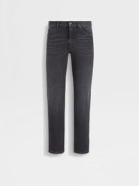 The dark grey stone-washed stretch cotton Roccia jeans have a chic, slim fit. INFO Enhanced with a touch of stretch for added comfort, the dark grey stone-washed stretch cotton Roccia jeans move with you throughout the day. The rugged wash offers the perfect base for casual looks, while the slim fit creates a long, lean silhouette. The inspiration for the Roccia Jeans, Roccia the Italian word for 'Rock', was Born in Oasi Zegna — the home of our values in the Italian Alps. Inspired by classic workwear, they're both hardwearing and elegant, making them a reliable foundation to any look. Customize this item with our Made to Measure Service. For more information, please contact our Customer Care or visit your nearest stores. PRODUCT CODE E8I80-CITY-002 MATERIALS AND CARE Main body: 99% Cotton; 1% Elastane Lining: 65% Polyester; 35% Cotton Max washing temp 30°C, mild process. Do not bleach. Do not tumble dry. Line drying in the shade. Iron at max 110°C. Do not dry clean. Wash separately. Wash inside out. FIT AND PRODUCT DETAILS • Slim fit • 17.5 cm narrow hem • Zip and button closure • 5-pocket style • Stone wash • Denim weight: 9.5 ounces • Model is 188 cm tall (6.2 feet) and wears a UK size 32.