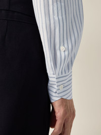 A striped pattern in dark indigo blue and white brings this cotton-linen-silk shirt to life. INFO A sumptuously soft silk, linen and cotton blend expresses ZEGNA's vision of luxury tailoring with this elegant long-sleeve shirt, standing out in dark indigo blue and white stripes. Its regular-fit silhouette features a versatile semi-spread collar and standard cuffs. PRODUCT CODE 302334A3-9NS0AT MATERIALS AND CARE 43% Cotton; 39% Linen; 18% Mulberry Silk Max washing temp 30°C, mild process. Do not bleach. Do not tumble dry. Flat drying. Iron at max 110°C. Do not dry clean. FIT AND PRODUCT DETAILS • Regular fit • Tailoring shirt • Semi-spread collar • Rounded hem • Standard cuffs • Button closure • Striped pattern • Light-weight fusing • 79 cm length on size 39