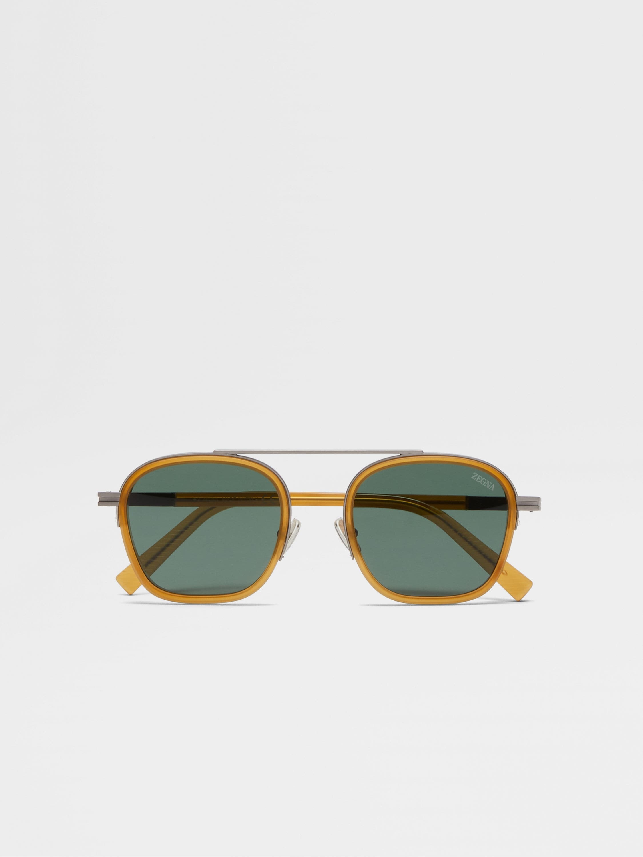 With their special construction, the dark yellow Orizzonte I acetate and metal sunglasses are an ultra-contemporary choice. INFO These dark yellow Orizzonte I sunglasses are characterized by a special construction with a high metal bridge, providing the inspiration behind their name. Defined by a stand-out combination of acetate and metal, these frames are equipped with adjustable nose pads for a secure fit, featuring the Zegna Logo. Enriched with chiseled lines on the temple tips and the shiny dark ruthenium Zegna 232 Road Brand Mark on the corners. ORIZZONTE (oridˈdzonte) — ITALIAN FOR 'HORIZON' The inspiration for the Orizzonte I Sunglasses was Born in Oasi Zegna — the home of our values in the Italian Alps. Shaped to a contemporary unbridged silhouette, they're accented with our iconic 232 Road Brand Mark and ZEGNA logo, then finessed with a slender brow bar that draws from the panoramic mountain-top views in a 100km² natural territory. PRODUCT CODE EZ0231-5145N MATERIALS AND CARE Acetate; Metal Clean your eyewear using a soft cloth, preferably microfiber, with water or a mild detergent. To avoid scratching the lenses, never use paper towels or clothing to clean your eyewear. Do not use household detergents or soaps to clean your eyewear; these products will damage the lenses over time. FIT AND PRODUCT DETAILS • Lens 51 mm – Bridge 22 mm – Temple 145 mm • Base 2 • Finishing: matte • Single bridge • Acetate end tips and rims • Matte medium bronze Zegna 232 Road Brand Mark on the temples as a corner detail • Laser-inscribed Zegna Logo on the inside of the temple and on the lens • Adjustable nose pads with bold Zegna Logo • Chiseled lines on the temple tips
