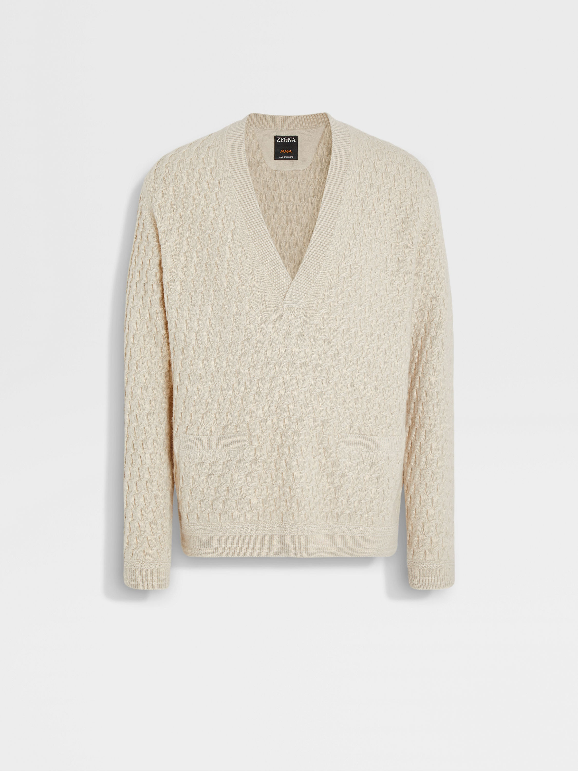 Elevated knitwear at its finest: this light beige V-neck is crafted from ZEGNA's exclusive Oasi Cashmere. INFO As seen in the ZEGNA Fashion Show, this V-neck sweater is knit with a tactile cable stitch from Oasi Cashmere: meticulously selected fibers that honor our commitment to traceability. Presented in a sophisticated light beige hue, it features welt pockets for a smart touch. PRODUCT CODE UGSK71A2-VNS-N02 MATERIALS AND CARE 100% Cashmere The inspiration behind this Oasi Cashmere collection garment was born in Oasi Zegna, a 100km² natural territory and the home of our values. It's crafted from Oasi Cashmere fibres, made with 100% certified traceable fibres. The Oasi Cashmere collection follows in the footsteps of our Founder, who envisioned a vertically integrated system of producing textiles. Wash by hand. Do not bleach. Do not tumble dry. Flat drying. Iron at 110°C. Professional dry cleaning in hydrocarbons, mild process. Wash and iron inside out. FIT AND PRODUCT DETAILS • Regular fit • Ribbed V-neck collar • 7 gauge • Ribbed hem and cuffs • Welt pockets • Cable stitch