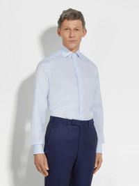 This shirt is made from Zegna's 300 Cotton with a light blue and white micro-checked pattern. INFO This elegant long-sleeve shirt is made from Zegna's 300 Cotton: an exquisite fabric that can stand up to any formal occasion. Featuring a light blue and white micro-checked pattern, it features a spread collar and standard cuffs for timeless sartorial allure. PRODUCT CODE 902130A9-9NS0LB MATERIALS AND CARE 100% Cotton Max wash temp 40°C. Do not bleach. Do not tumble dry. Professional dry cleaning in tetrachloroethene and hydrocarbons. FIT AND PRODUCT DETAILS • Regular fit • Tailoring shirt • Spread collar • Standard cuffs • Button closure • Rounded hem • Micro-checked pattern • 79 cm length on size 39
