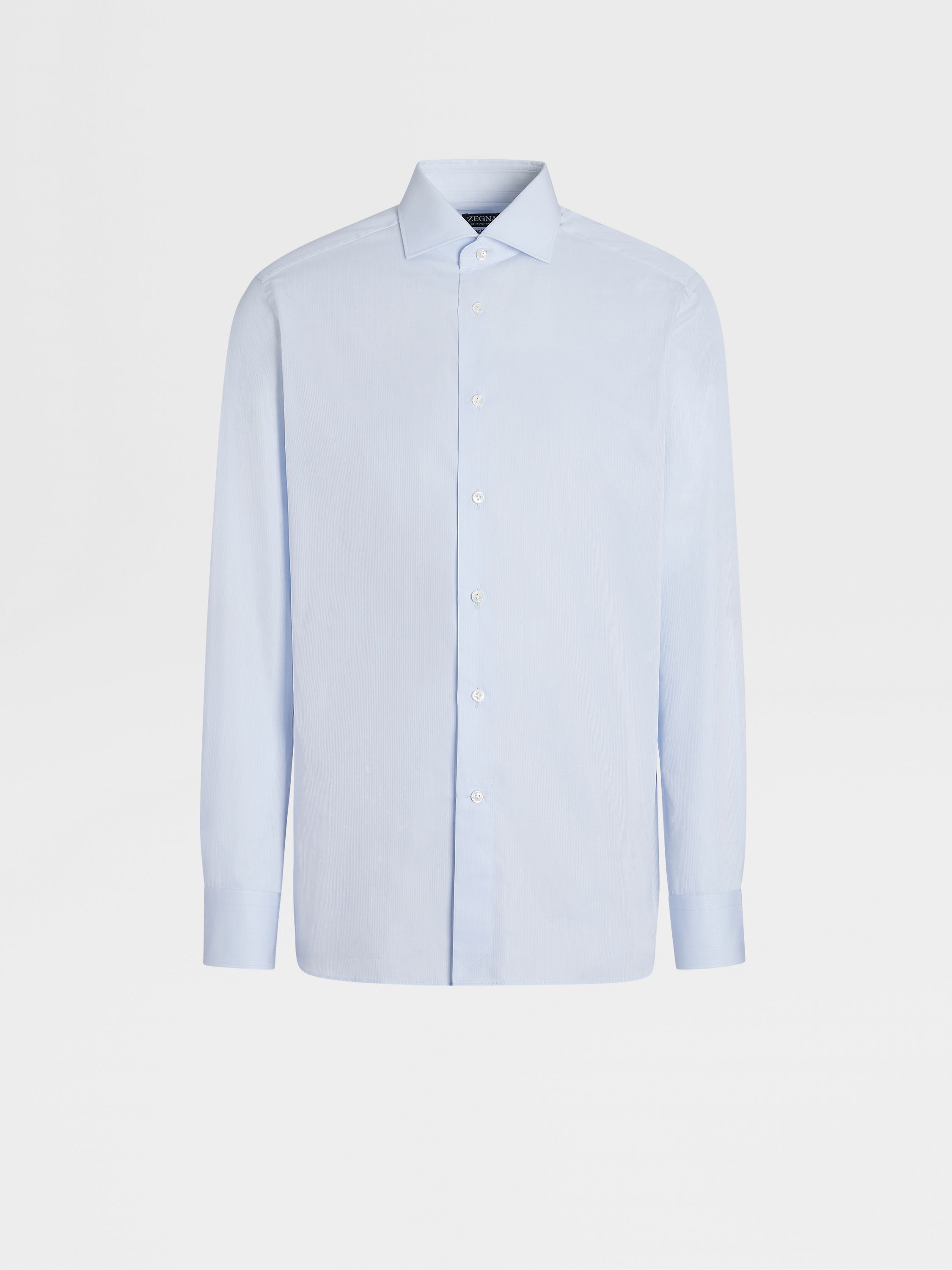 The light blue micro-striped Centoventimila cotton long-sleeve tailoring shirt is characterized by its very high thread count. INFO Made from one of Zegna's most exclusive cotton yarns, the light blue micro-striped Centoventimila cotton long-sleeve tailoring shirt is exceptionally silky and lightweight. A micro-striped pattern adds subtle dimension to the classic shirt, which is topped off with a spread collar. PRODUCT CODE C02011A6-9NS0LB MATERIALS AND CARE 100% Cotton Centoventimila — Italian for 120.000 — is named after its high threadcount. Garments crafted from this fabric are extremely lightweight and have a soft, silk-inspired hand. Max washing temp 40°C. Do not bleach. Do not tumble dry. Iron at max 150°C. Professional dry cleaning in tetrachloroethene and hydrocarbons. FIT AND PRODUCT DETAILS • Regular fit • Tailoring shirt • Spread collar • Standard cuffs • Button closure • Rounded hem • Micro-striped pattern • 79 cm length on size 39 • Model is 188 cm tall (6.2 feet) and wears an Italian size 39.