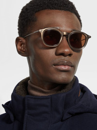 These light brown titanium sunglasses are part of a Limited Edition, blending modern style with superior functionality. INFO Crafted from sleek titanium with a matte finish, these exclusive light brown sunglasses are part of a Limited Edition of individually numbered frames. Defined by an understated round silhouette with a single nose bridge, they feature grip paddle temple tips for enhanced hold. Enriched with our signature 232 Road Brand Mark on the temples and a classic ZEGNA Logo on the lens. PRODUCT CODE EZ0275-4635E MATERIALS AND CARE Full Titanium Clean your eyewear using a soft cloth, preferably microfiber, with water or a mild detergent. To avoid scratching the lenses, never use paper towels or clothing to clean your eyewear. Do not use household detergents or soaps to clean your eyewear; these products will damage the lenses over time. FIT AND PRODUCT DETAILS • Lens 46 mm – Bridge 25 mm – Temple 145 mm • Base 2 • Not suitable for mounting prescription lenses • Finishing: matte • Single bridge • Grip paddle on the end of the temples • ZEGNA 232 Road Brand Mark on the temples as a corner detail • ZEGNA Logo on the lens • Adjustable nose pads