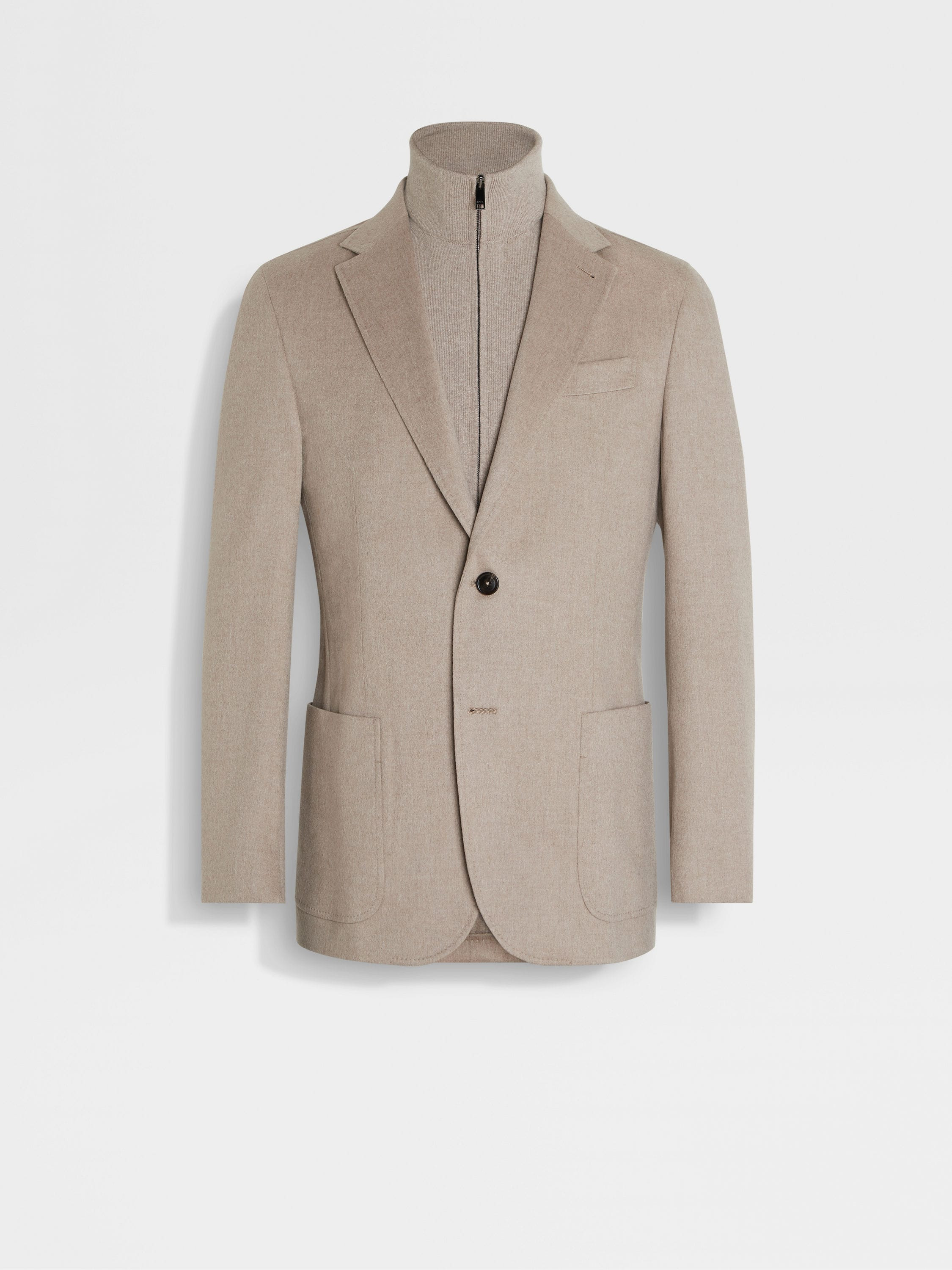 This light taupe Oasi Cashmere jacket features a detachable bib for endless versatility. INFO Showcasing ZEGNA's vision of quiet luxury, refined elegance and effortless functionality, this light taupe Oasi Cashmere jacket is made from one of the brand's most exclusive natural fibers. Styled with classic notch lapels, it features a detachable knit bib and roomy patch pockets. PRODUCT CODE UGC46A2-DYR-N02 MATERIALS AND CARE Main body: 100% Cashmere Leather details: Calfskin Lining: 53% Cotton; 47% Cupro The inspiration behind this Oasi Cashmere collection garment was born in Oasi Zegna, a 100km² natural territory and the home of our values. It's crafted from Oasi Cashmere fibres, made with 100% certified traceable fibres. The Oasi Cashmere collection follows in the footsteps of our Founder, who envisioned a vertically integrated system of producing textiles. Do not wash. Do not bleach. Do not tumble dry. Iron at max 110°C. Professional dry cleaning in hydrocarbons, mild process. Protect leather details before washing. Do not iron leather details. FIT AND PRODUCT DETAILS • Regular fit • Notch lapels • Detachable bib in knit Oasi Cashmere • Leather details • Button closure • Patch pockets • 73,5 cm length on size 48