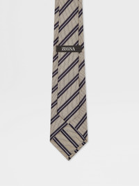 This light taupe striped tie is crafted from a refined mulberry silk and linen blend. INFO The sophisticated allure of a silk-linen blend provides the perfect canvas for an elegant striped pattern with this jacquard tie. Presented in a versatile light taupe colorway. PRODUCT CODE Z9C35TA9-1PC-BE1 MATERIALS AND CARE Main body: 95% Mulberry Silk; 5% Linen Lining: 95% Mulberry Silk; 5% Linen Do not wash. Do not bleach. Do not tumble dry. Do not iron. Professional dry cleaning in tetrachloroethene and hydrocarbons, mild process. FIT AND PRODUCT DETAILS • Blade width: 8 cm / 3.1 in • Striped jacquard pattern • Made in Italy