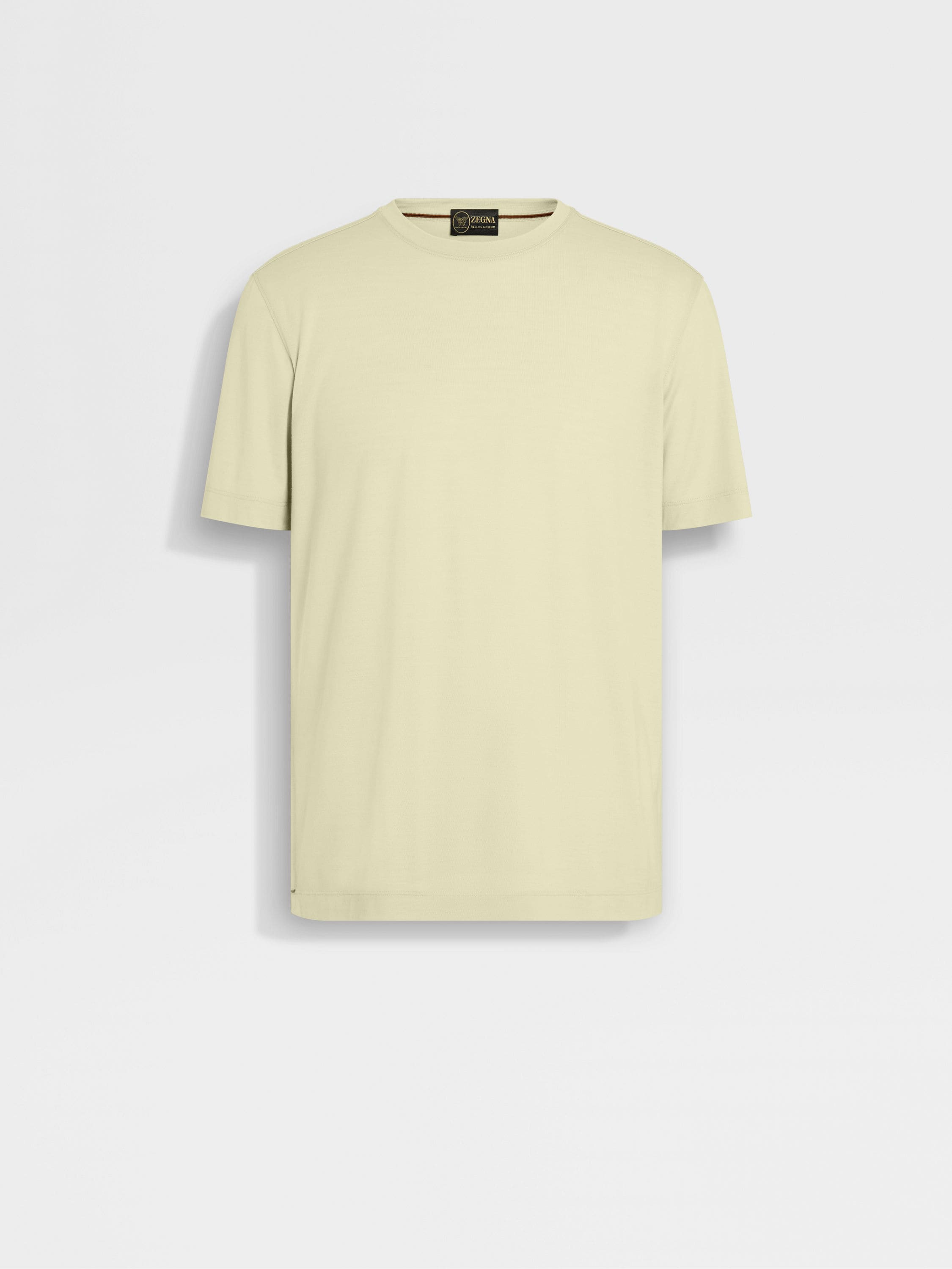 Introducing the light yellow Vellus Aureum T-shirt. Exceptional softness meets understated style for everyday wear. INFO The light yellow Vellus Aureum T-shirt reimagines a wardrobe staple through the lens of unique quality. Crafted from exceptionally fine wool, it offers softness and refinement. The regular fit, crewneck collar and short sleeves maintain a classic silhouette, while the tubular hem and cuffs ensure a clean finish. PRODUCT CODE UFV97A9-FV7VL8-G01 MATERIALS AND CARE 100% Wool Vellus Aureum was inspired by our founder's quest for excellence to seek the finest wool in the world. Exquisitely fine in texture and rare, we're committed to certifying Vellus Aureum fibres as 100% traceable by the end of 2025. Do not wash. Do not bleach. Do not tumble dry. Iron at max 110°C. Professional dry cleaning in hydrocarbons. FIT AND PRODUCT DETAILS • Short sleeves • Crewneck collar • Tubular hem and cuffs • Regular fit
