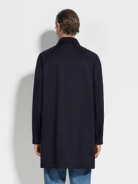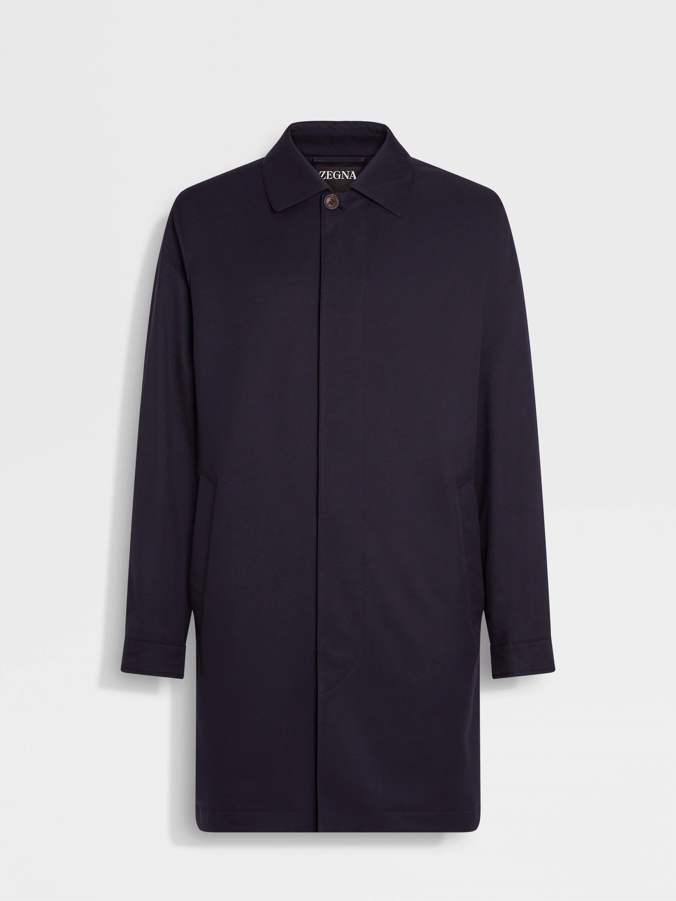 Choose functional elegance in this navy blue Motorin 300cc microfiber rain coat. INFO Crafted from navy blue microfiber, the Motorin 300cc rain coat is a refined wet-weather essential. Styled with an elegant shirt collar and sophisticated leather details in line with Zegna's vision of luxury leisurewear. ''Scooter' in Piedmontese Italian, Motorin pays homage to the era when Italians commuted to Oasi Zegna on scooters. This Motorin 300cc raincoat was designed with endless outdoor adventures in mind, making it lightweight, water repellent, and windproof. PRODUCT CODE UFTC5A9-FCT578-B09 MATERIALS AND CARE Main body: 100% Polyester Leather details: Calfskin Do not wash. Do not bleach. Do not tumble dry. Iron at max 110°C. Professional dry cleaning in hydrocarbons, mild process. Professional leather clean only. Protect leather details before washing. Protect metal accessories during washing. FIT AND PRODUCT DETAILS • Regular fit • Spread shirt collar • Button closure with concealed placket • Straight hem • Adjustable cuffs • Leather details • Slanted jet pockets • Water repellent • 95 cm length on size 48