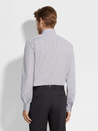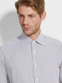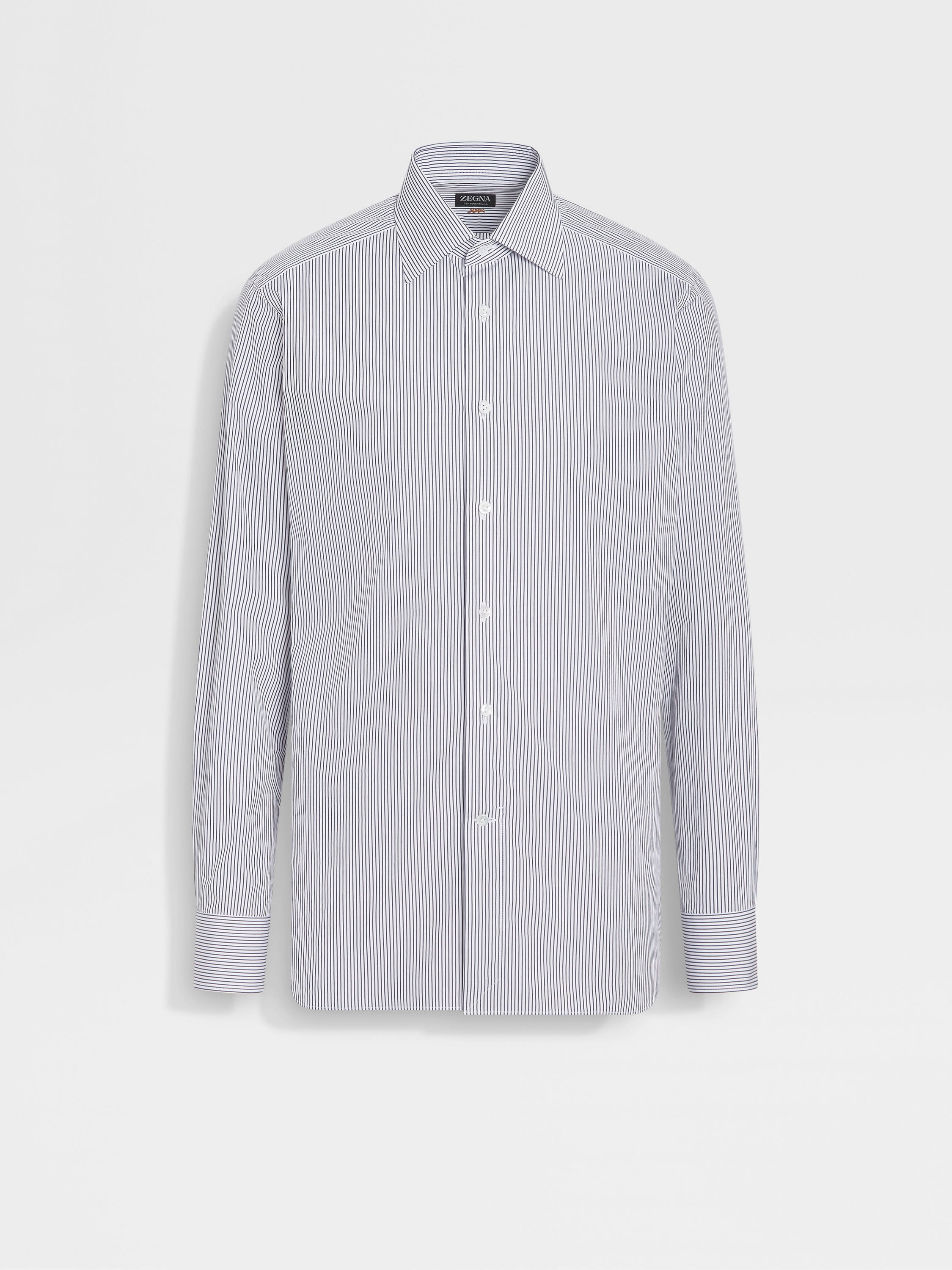 A micro-striped pattern in white and navy blue brings timeless charm to this long-sleeve Centoventimila cotton shirt. INFO Bringing timeless charm to formal looks with its navy blue and white micro-striped pattern, this shirt is crafted from luxurious Centoventimila cotton for an impeccably smooth, breezy feel. Its long-sleeved silhouette is styled with an elegant spread collar. PRODUCT CODE 202034A2-9NS0LB MATERIALS AND CARE 100% Cotton Centoventimila – Italian for 120,000 – is named after its high thread count. Garments crafted from this fabric are extremely lightweight and have a soft, silk-inspired hand feel. Max washing temp 40°C. Do not bleach. Do not tumble dry. Iron at max 150°C. Professional dry cleaning in tetrachloroethene and hydrocarbons. FIT AND PRODUCT DETAILS • Regular fit • Tailoring shirt • Spread collar • Standard cuffs • Button closure • Micro-striped pattern • 79 cm length on size 39