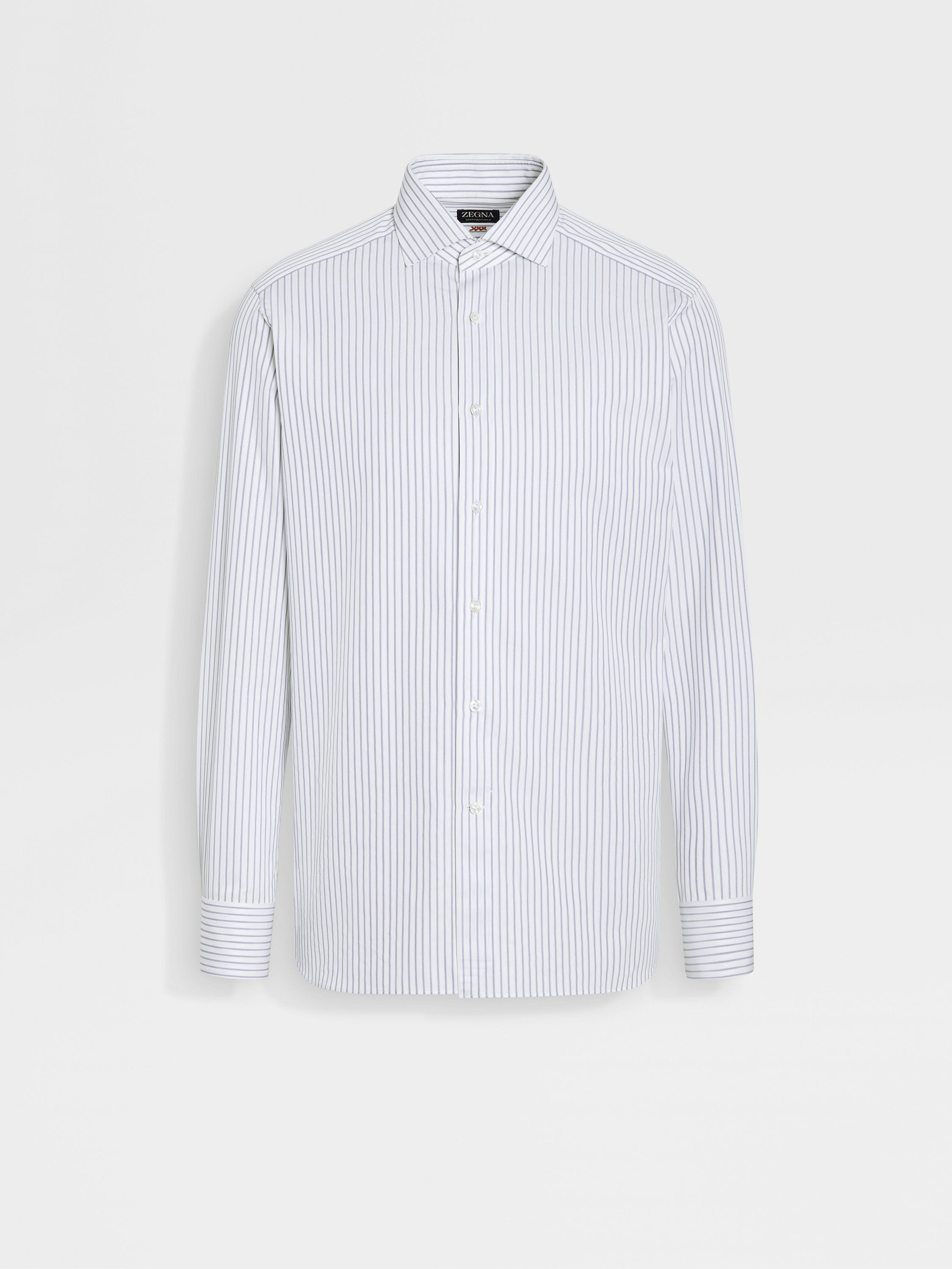 A white and navy blue structured striped pattern and soft Centoventimila cotton: this long-sleeve shirt is a formal essential. INFO Featuring long sleeves and a spread collar, this shirt is crafted from exquisite Centoventimila cotton for an impeccably smooth feel against the skin. Styled with a structured white and navy blue striped pattern. PRODUCT CODE 202020A2-9NS0LB MATERIALS AND CARE 100% Cotton Centoventimila – Italian for 120,000 – is named after its high thread count. Garments crafted from this fabric are extremely lightweight and have a soft, silk-inspired hand feel. Max washing temp 40°C. Do not bleach. Do not tumble dry. Iron at max 150°C. Professional dry cleaning in tetrachloroethene and hydrocarbons. FIT AND PRODUCT DETAILS • Regular fit • Tailoring shirt • Spread collar • Standard cuffs • Button closure • Structured striped pattern • 79 cm length on size 39