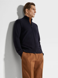 The navy blue Cashseta full zip cardigan features a two-toned jacquard knit pattern. INFO Knit from Zegna's refined blend of cashmere and silk, the navy blue Cashseta full zip cardigan is luxuriously soft to the touch. The zip-up cardigan features a ribbed stand collar and matching trim. This special material is yarn-dyed, creating subtle variations in each garment's pattern. PRODUCT CODE UEJ92A8-157-B98 MATERIALS AND CARE 70% Cashmere; 30% Mulberry Silk This sophisticated fabric combines the softness of cashmere with the smooth finish of fine silk. The yarns of Cashseta are dyed before the fabric is created, resulting in a melange that is unique to each garment. Wash by hand. Do not bleach. Do not tumble dry. Flat drying. Iron at max 110°C. Professional dry cleaning in hydrocarbons, mild process. Wash and iron inside out. FIT AND PRODUCT DETAILS • 18 gauge • Ribbed stand collar • Long sleeves • Ribbed trims • Full zip closure • Bicolor jacquard knit