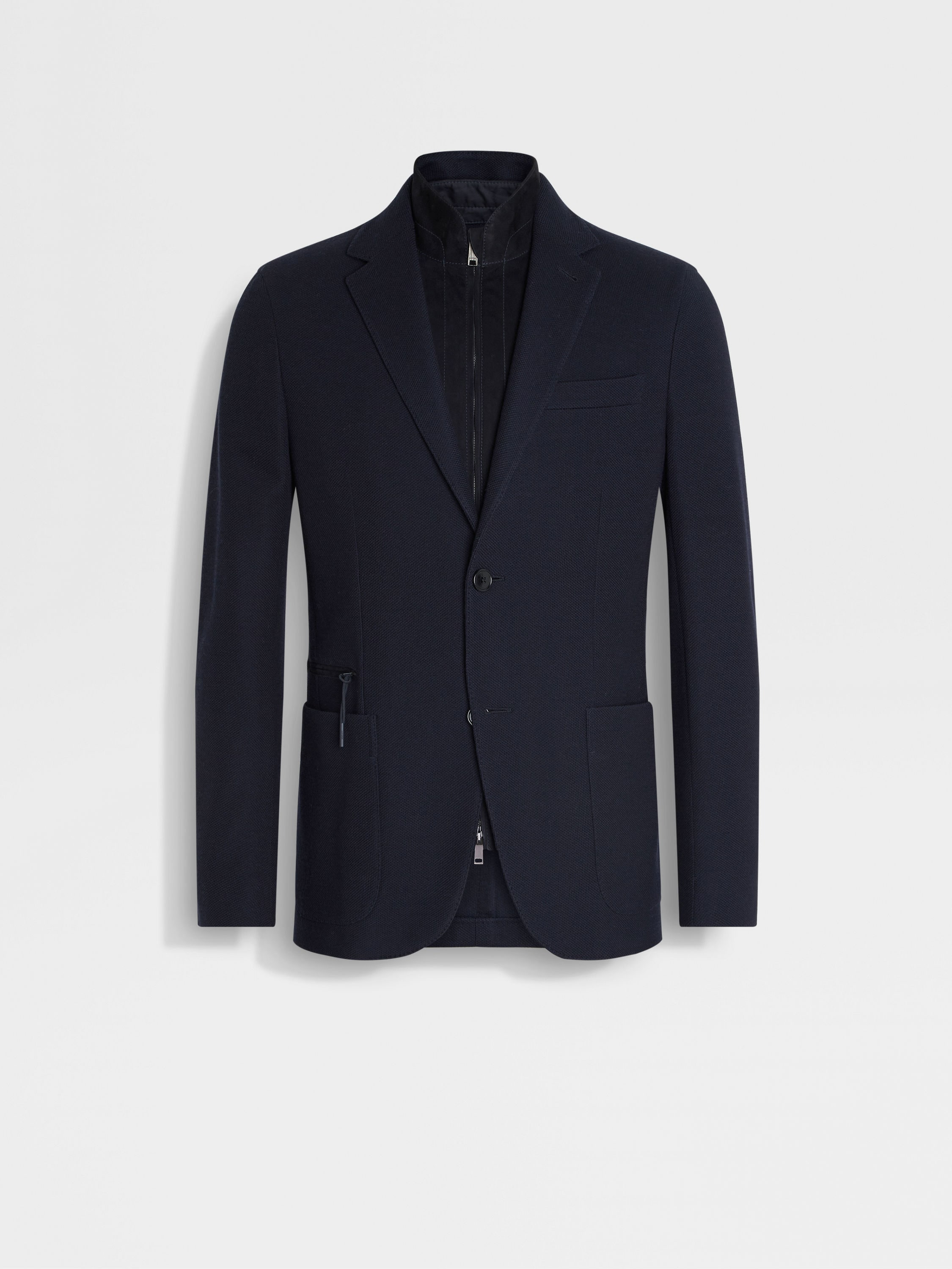 This navy blue High Performance™ jersey sweater jacket balances style and comfort in equal parts. INFO A casual take on fine tailoring: this navy blue sweater jacket is crafted from ZEGNA's flexible High Performance™ jersey, spun from a blend of extra-fine Merino wool and cotton with a honeycomb texture. Equipped with a detachable leather bib for endless versatility. PRODUCT CODE UGC60A2-DKR-B09 MATERIALS AND CARE Main body: 63% Wool; 37% Cotton Leather details: Lambskin Lining: 100% Polyester This garment is crafted from High Performance™ jersey, which incorporates extra-fine Merino, a fibre prized for its naturally soft, breathable and moisture-wicking properties. The structure of the fabric imbues it with elasticity, making it ideal for life on the move. Do not wash. Do not bleach. Do not tumble dry. Iron at max 110°C. Professional dry cleaning in hydrocarbons, mild process. Protect leather details before washing. Do not iron leather details. FIT AND PRODUCT DETAILS • Regular fit • Double vents • Notch lapels • Detachable leather bib • Breathable fabric • Honeycomb pattern • Button closure • Patch pockets • Zip pocket • Deconstructed, canvas • Lined • 73,5 cm length on size 48