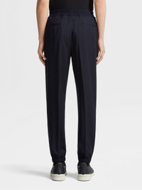 Update your casual wardrobe with the navy blue High Performance™ wool joggers. INFO Zegna's navy blue High Performance™ wool joggers are soft and breathable, for exceptional comfort throughout the day. The classic colorway keeps the look sleek, while leather details add a final touch of edge. PRODUCT CODE E8I01-TT20-011 MATERIALS AND CARE Main body: 100% Wool Lining: 100% Cotton High Performance™ fabric incorporates extrafine merino that's breathable, lightweight and wrinkle resistant, making it ideal for life on the move. Suitable for wear throughout all seasons, it naturally wicks moisture for exceptional comfort. Do not wash. Do not bleach. Do not tumble dry. Iron at max 110°C. Professional dry cleaning in hydrocarbons, mild process. Wash inside out. Protect metal tips during washing. FIT AND PRODUCT DETAILS • Jogger fit • 15.5 cm elasticated hem • Knit belt • Drawstring and zip closure • Leather details • Breathable fabric